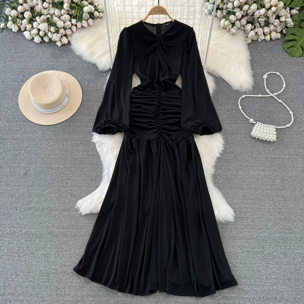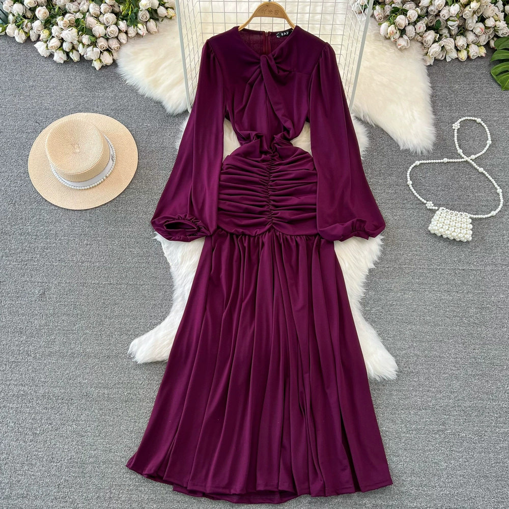 Pleated Lantern Long Sleeve Twist A-Line Elegant Dress