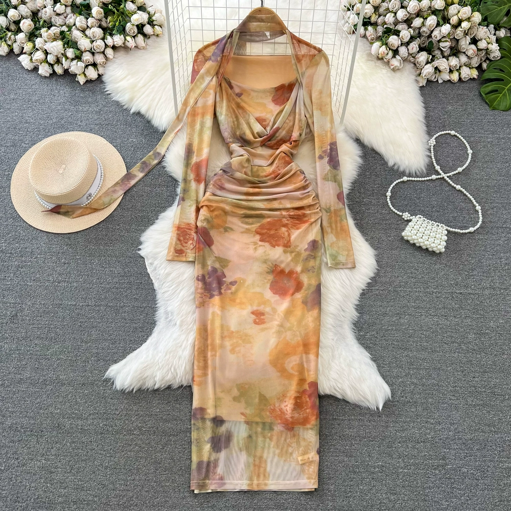 Pleated long-sleeved sfumato print dress in elegant mesh
