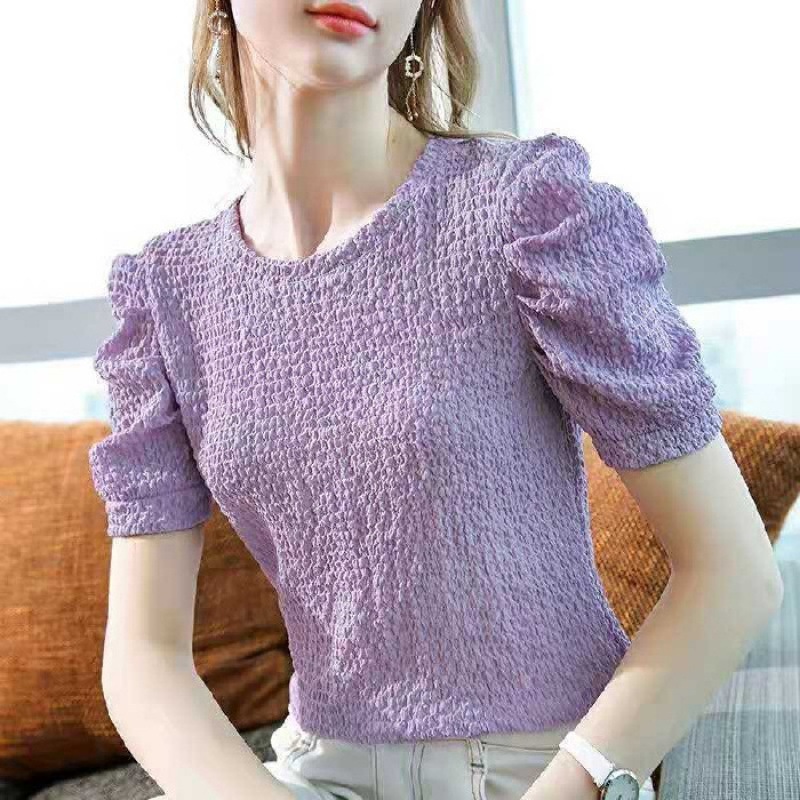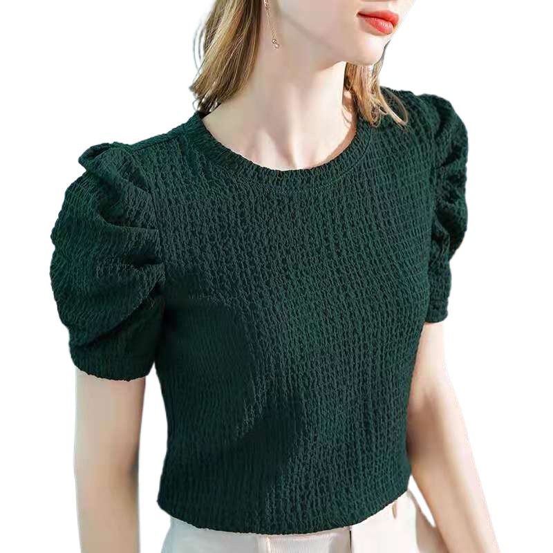 | nameOriginal | Pleated Plaid Top 2024 Summer Women's European Station Round Neck Short-sleeved T-shirt Women's French Retro Puff Sleeve T-shirt |