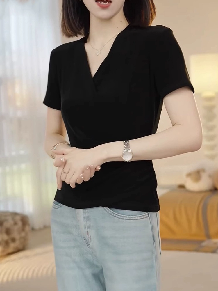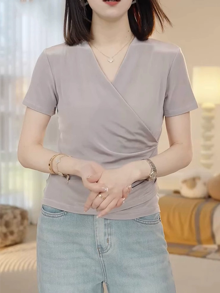 Pleated right shoulder fashionable thin design short-sleeved T-shirt