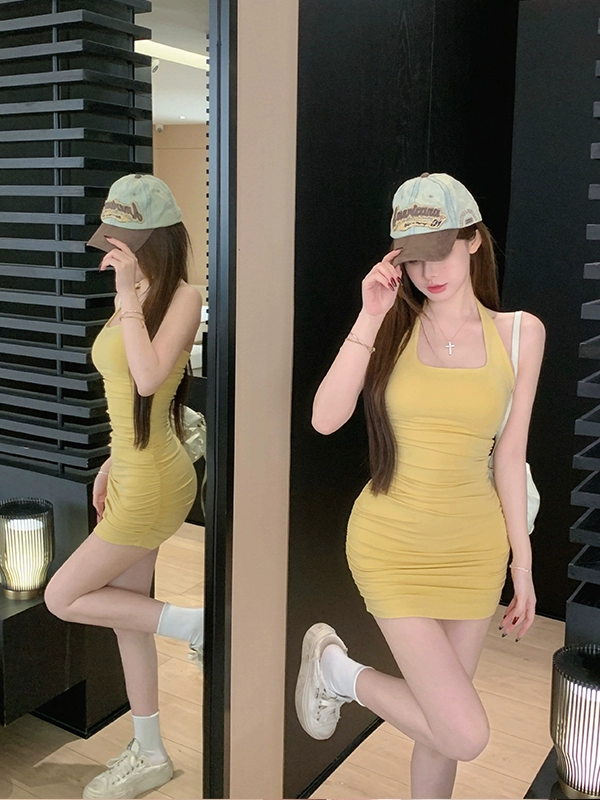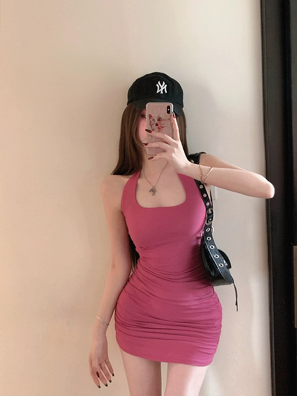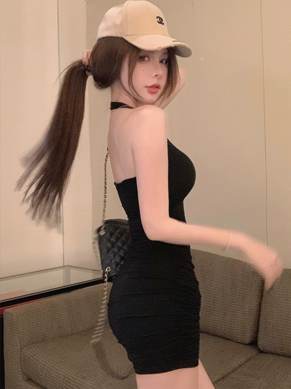 | nameOriginal | Pleated sexy backless dress summer halter neck strap |