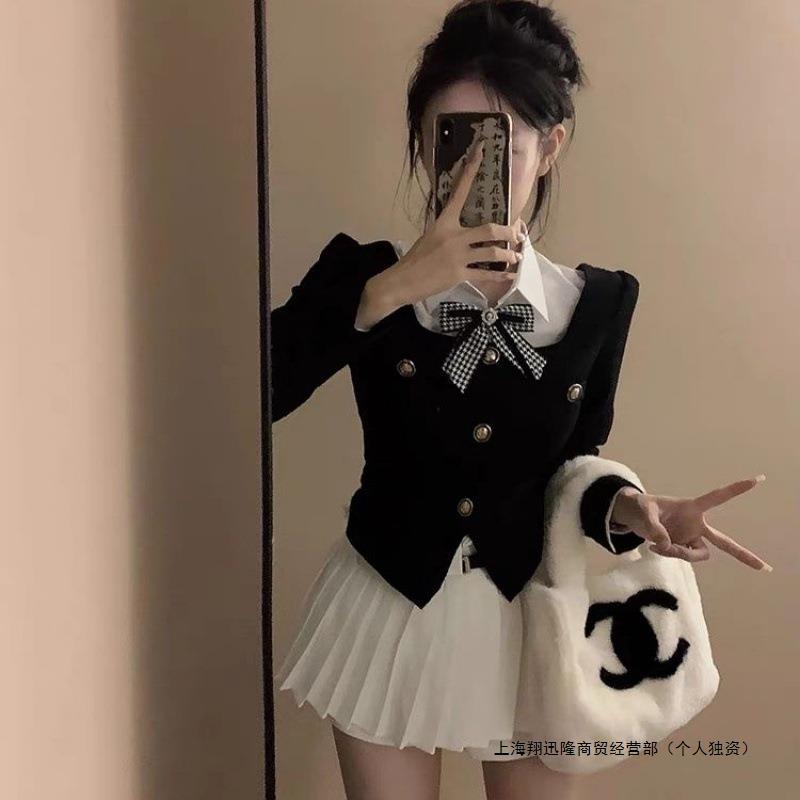 | nameOriginal | Pleated Skirt Two-piece Set High Waist Fake Two-piece Spice Girl Coat Top Autumn Chanel Style Plus Academy Style Women's New Style |