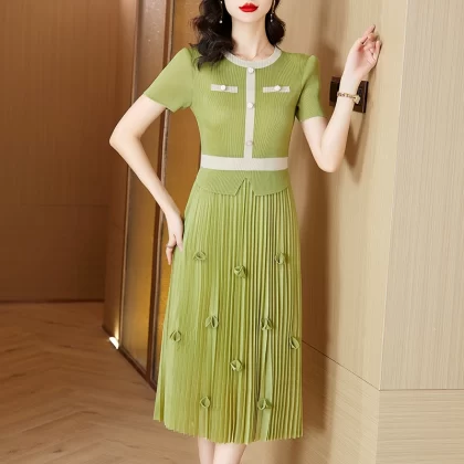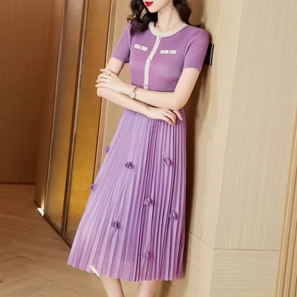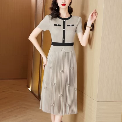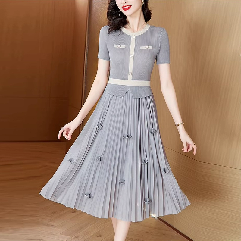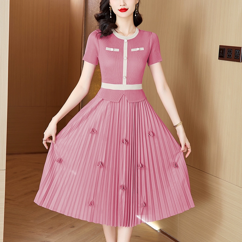 Pleated summer new style round neck splicing slim fake two-piece