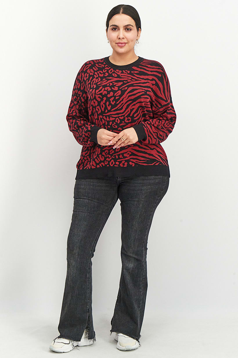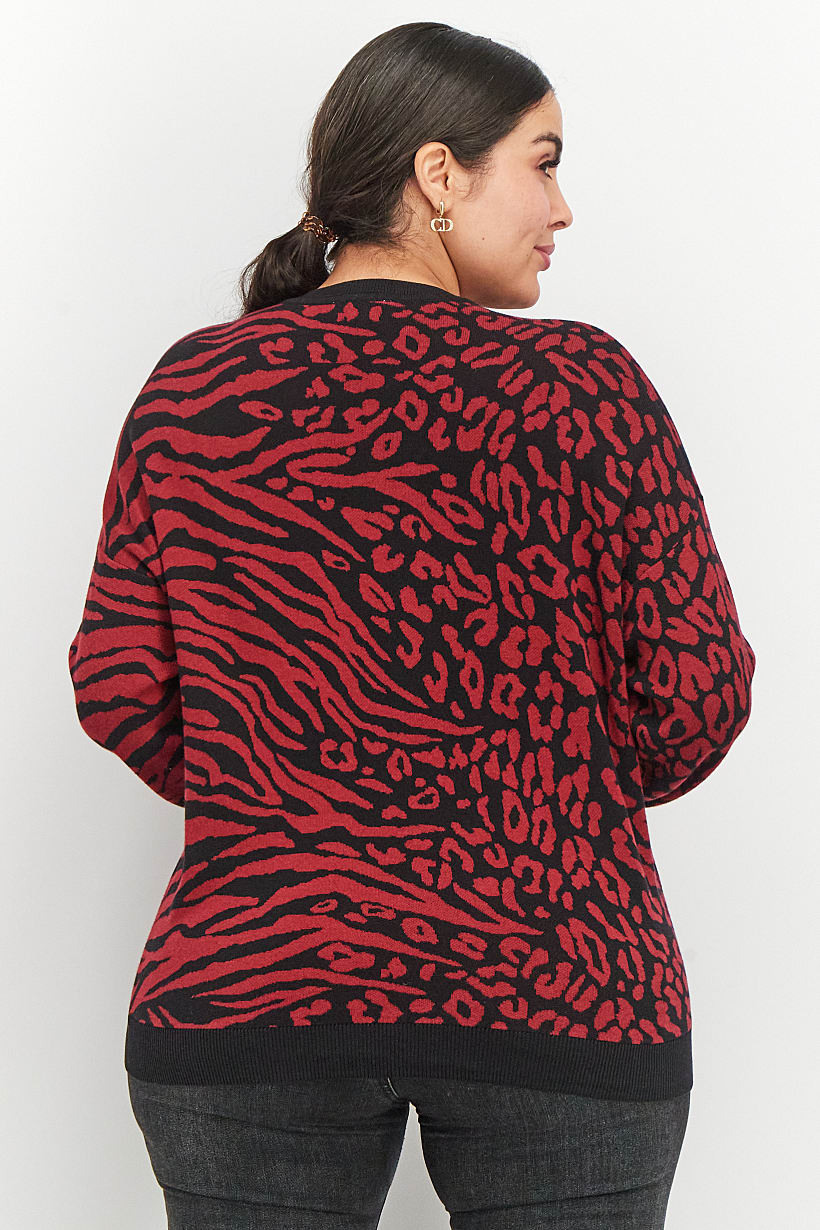 | nameOriginal | Women Plus Size Animal Print Sweater, Black and Red |