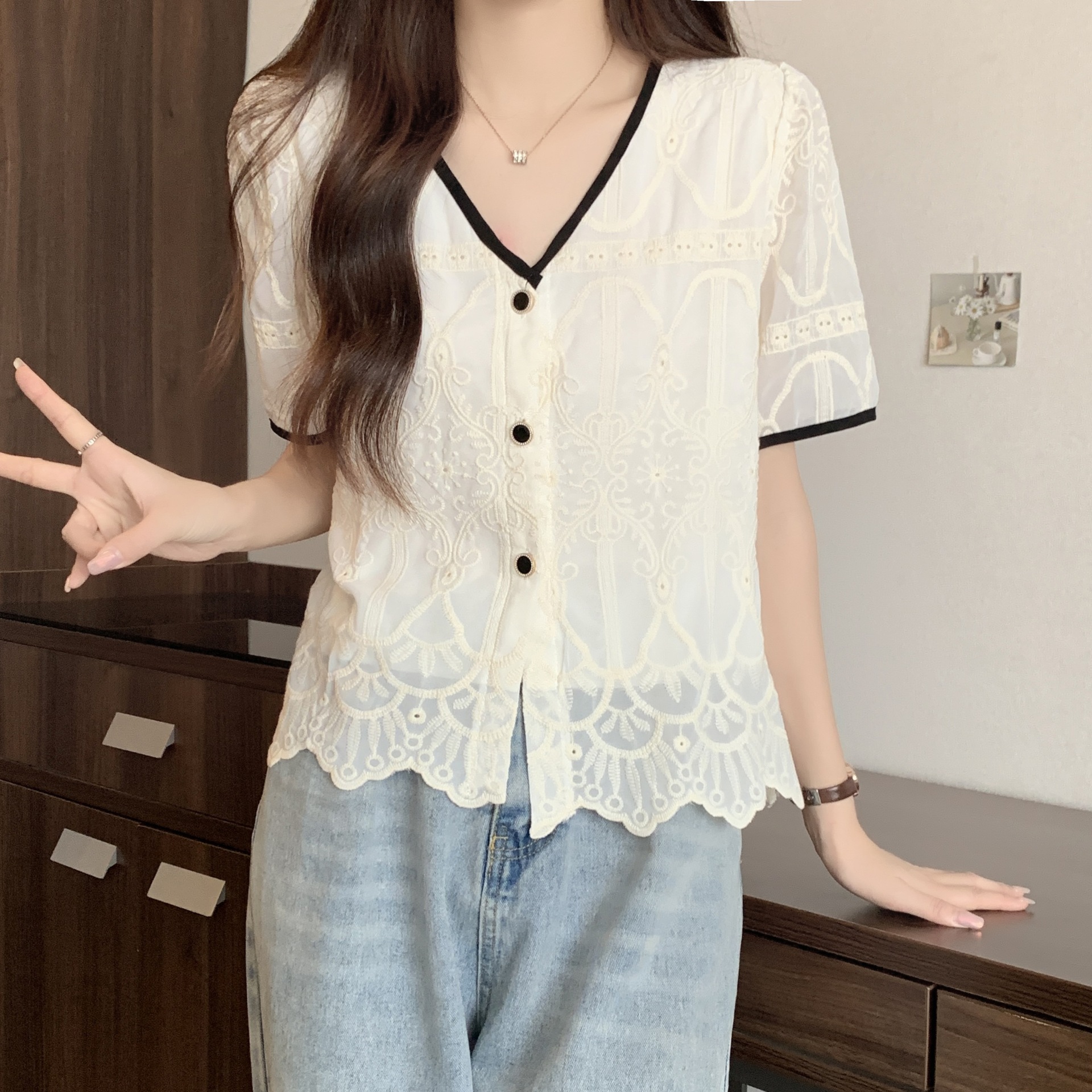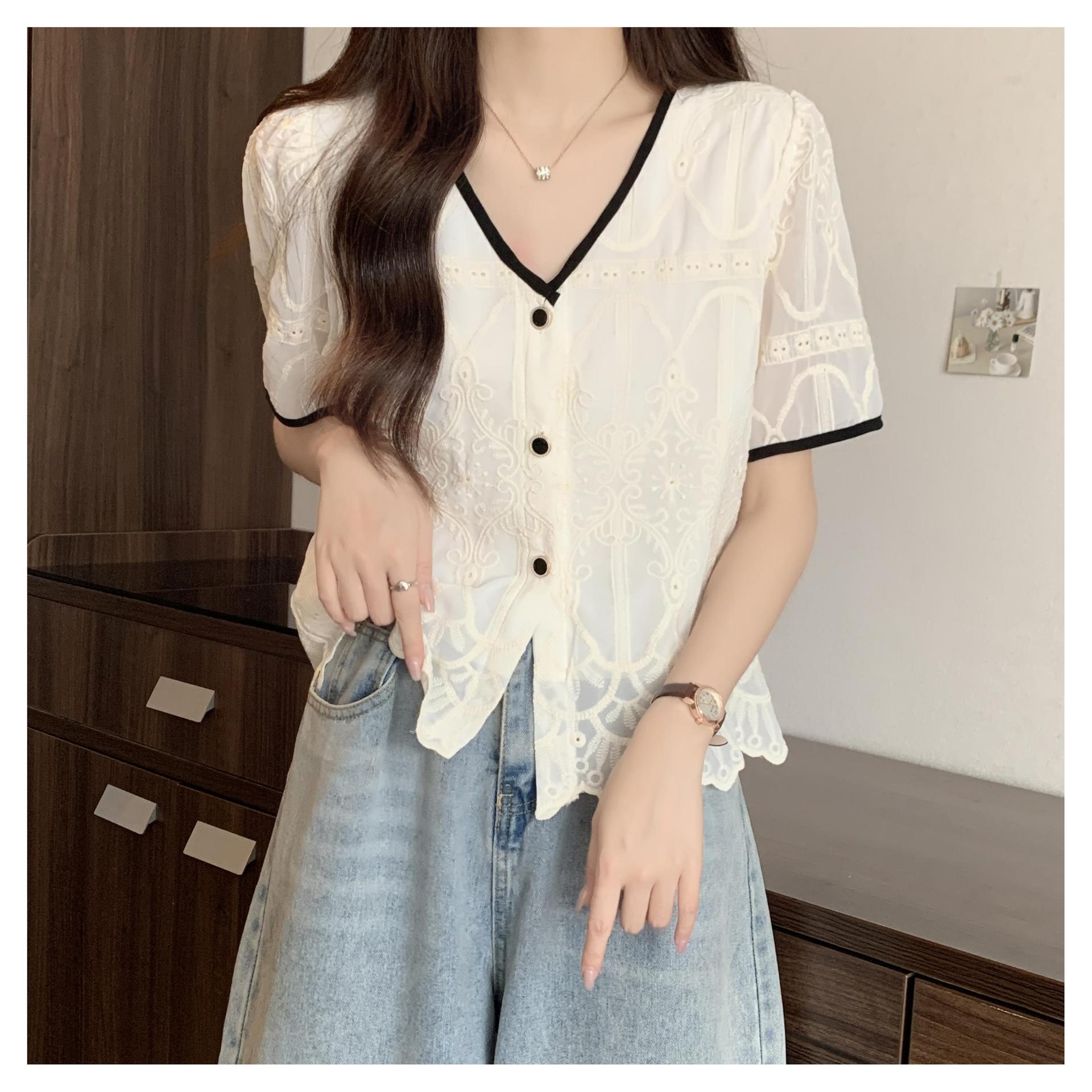 | nameOriginal | plus size Chanel Style V-neck Short-sleeved Shirt 2024 New Summer chubby girl Slimming Top Design Niche Female |
