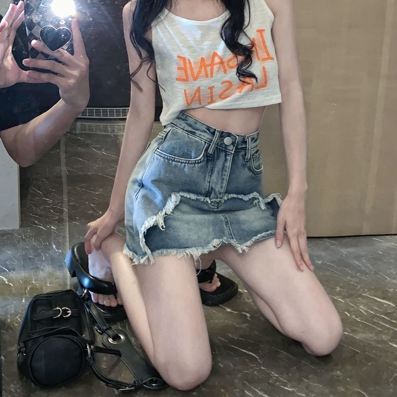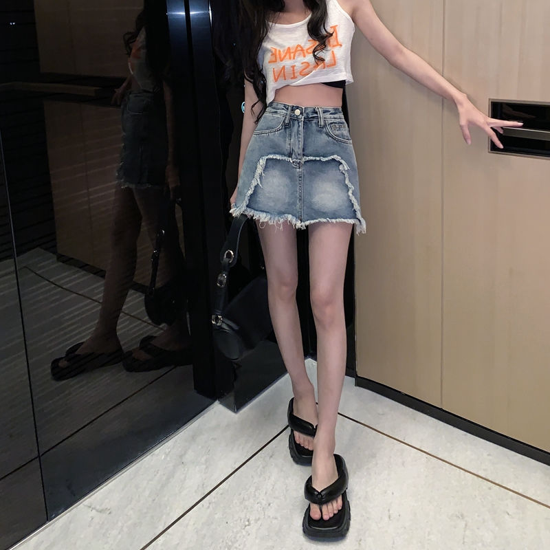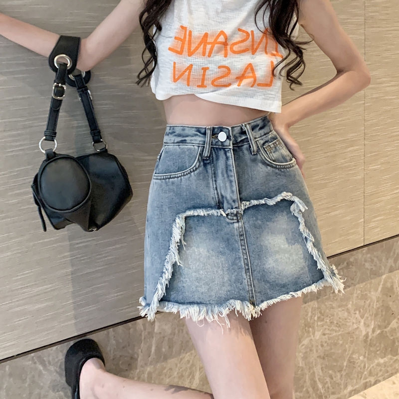 plus size chubby girl Denim Skirt Spring and Summer Retro Fringe Tassel A- line Skirt High Waist Slimming All-match Short Skirt for Women