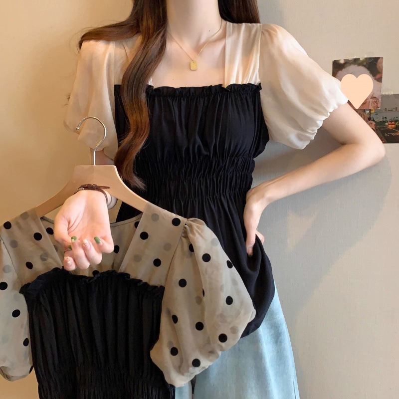 | nameOriginal | plus size Chubby Summer Tight Waist Slimming Square Collar Chiffon Shirt Women's French Style Chic Unique Puff Sleeve Top for Women |