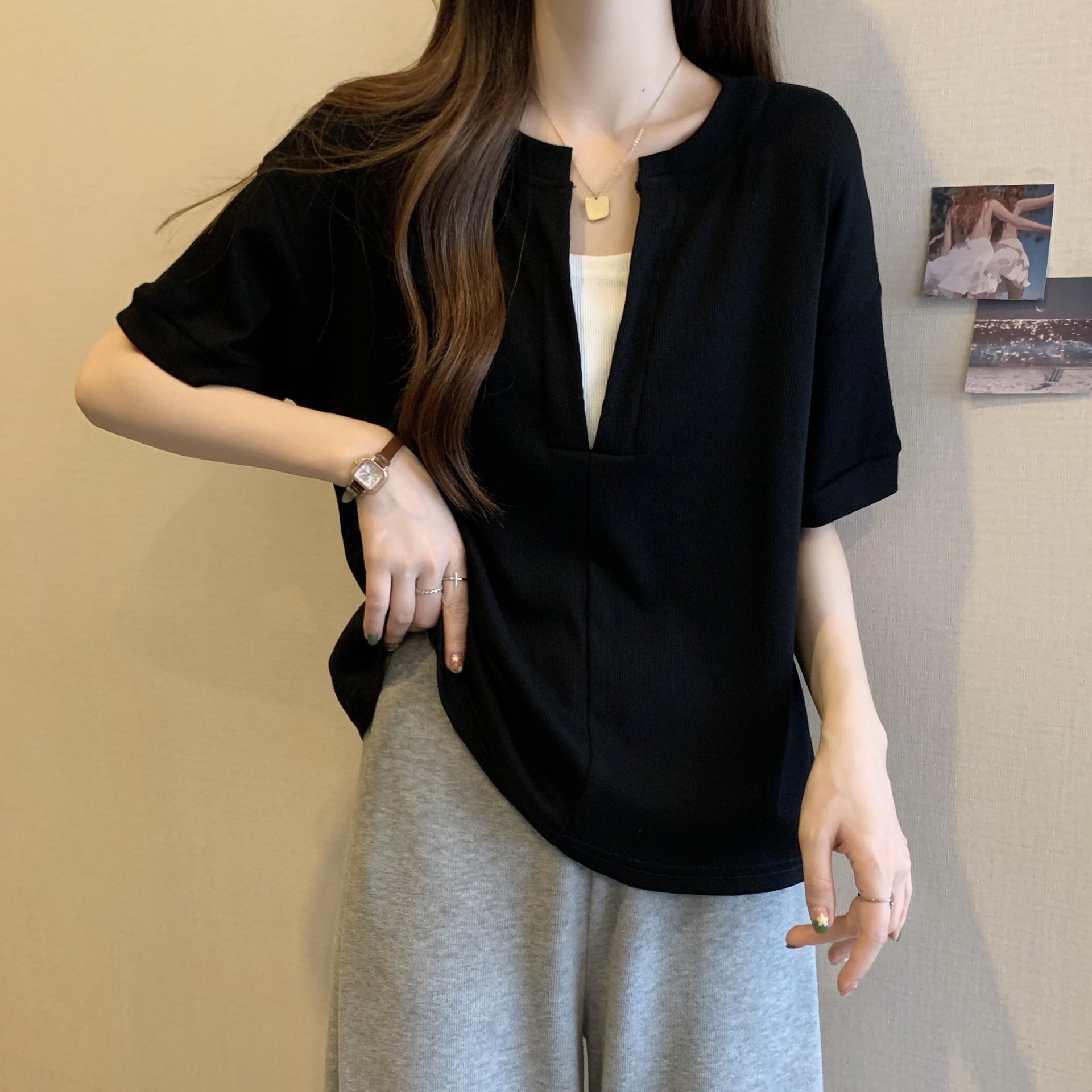 | nameOriginal | plus size Fake Two-Piece V-Neck Short-Sleeved T-Shirt Women's Summer chubby girl Belly-Covering Huge Slimming Loose Design Short Top |