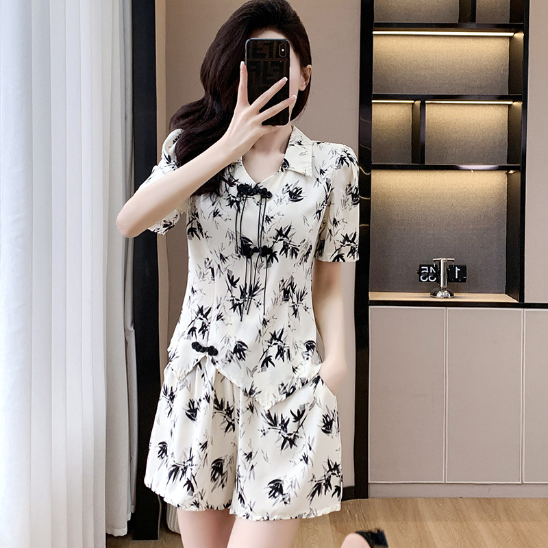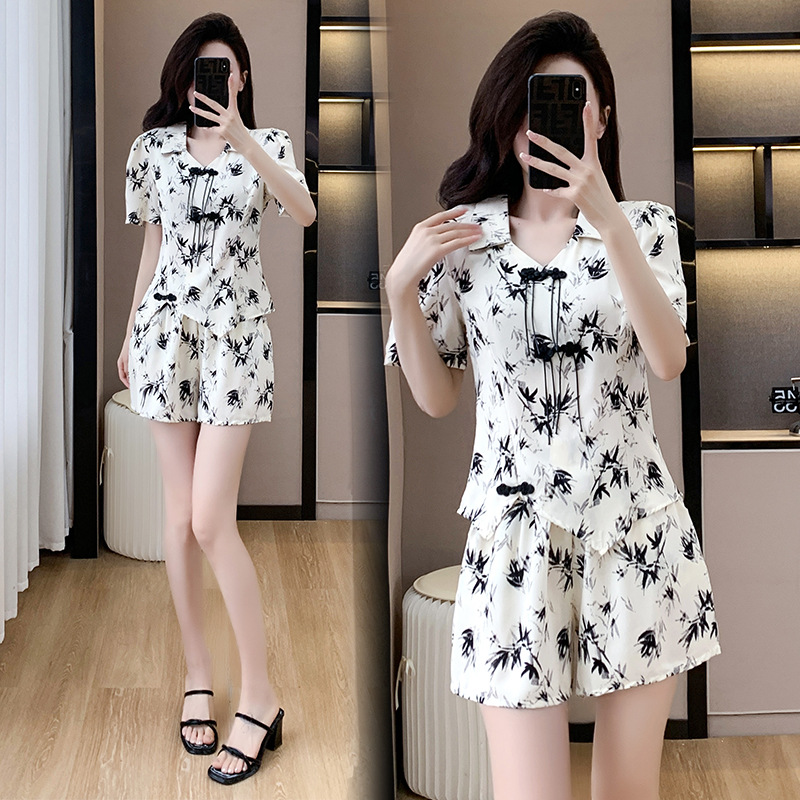 plus size Fashion suit Women's 2024 Summer New chubby girl Elegant Slim Retro Printed Top and Shorts Two-piece Set