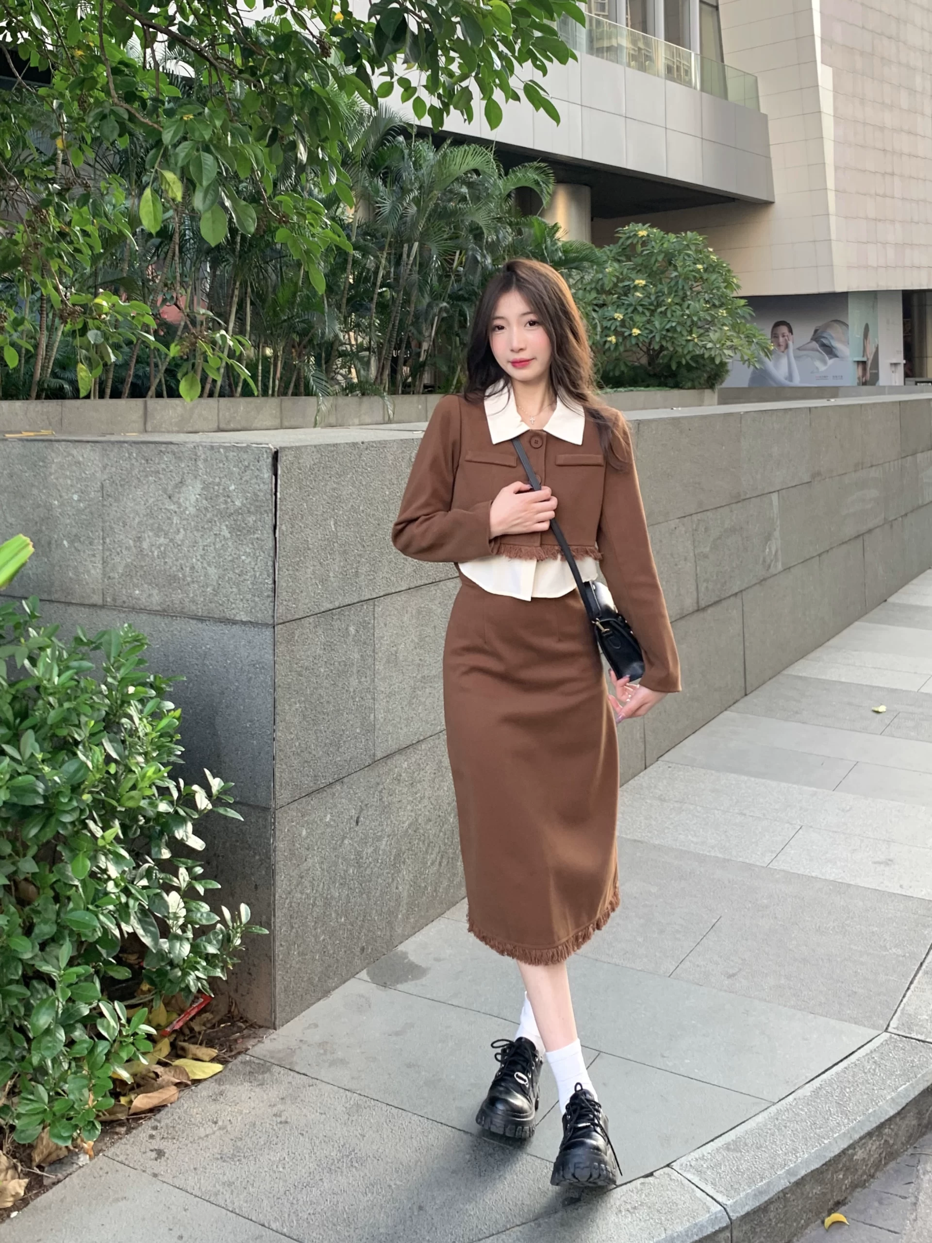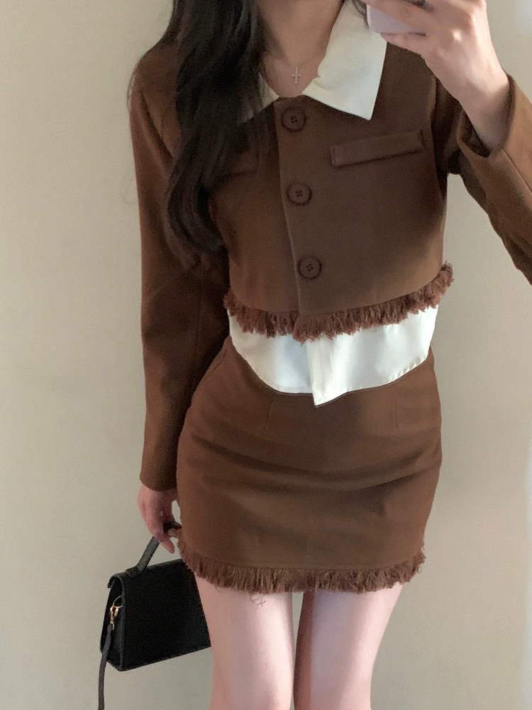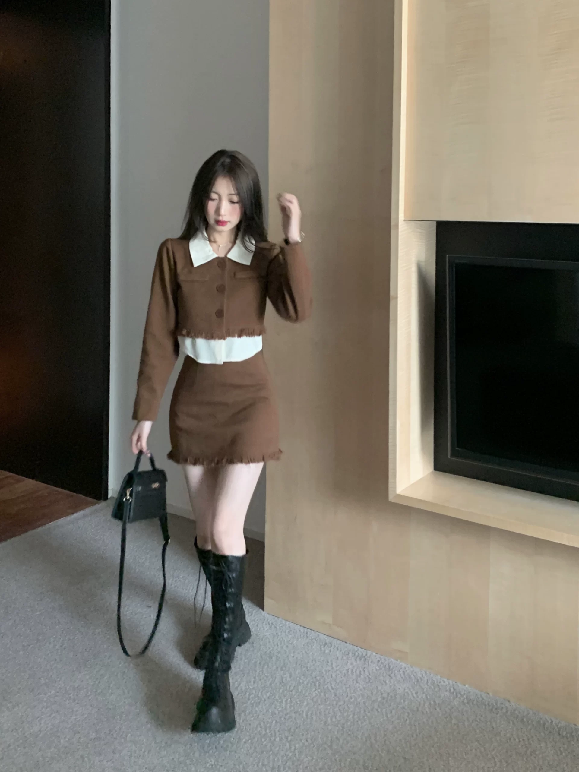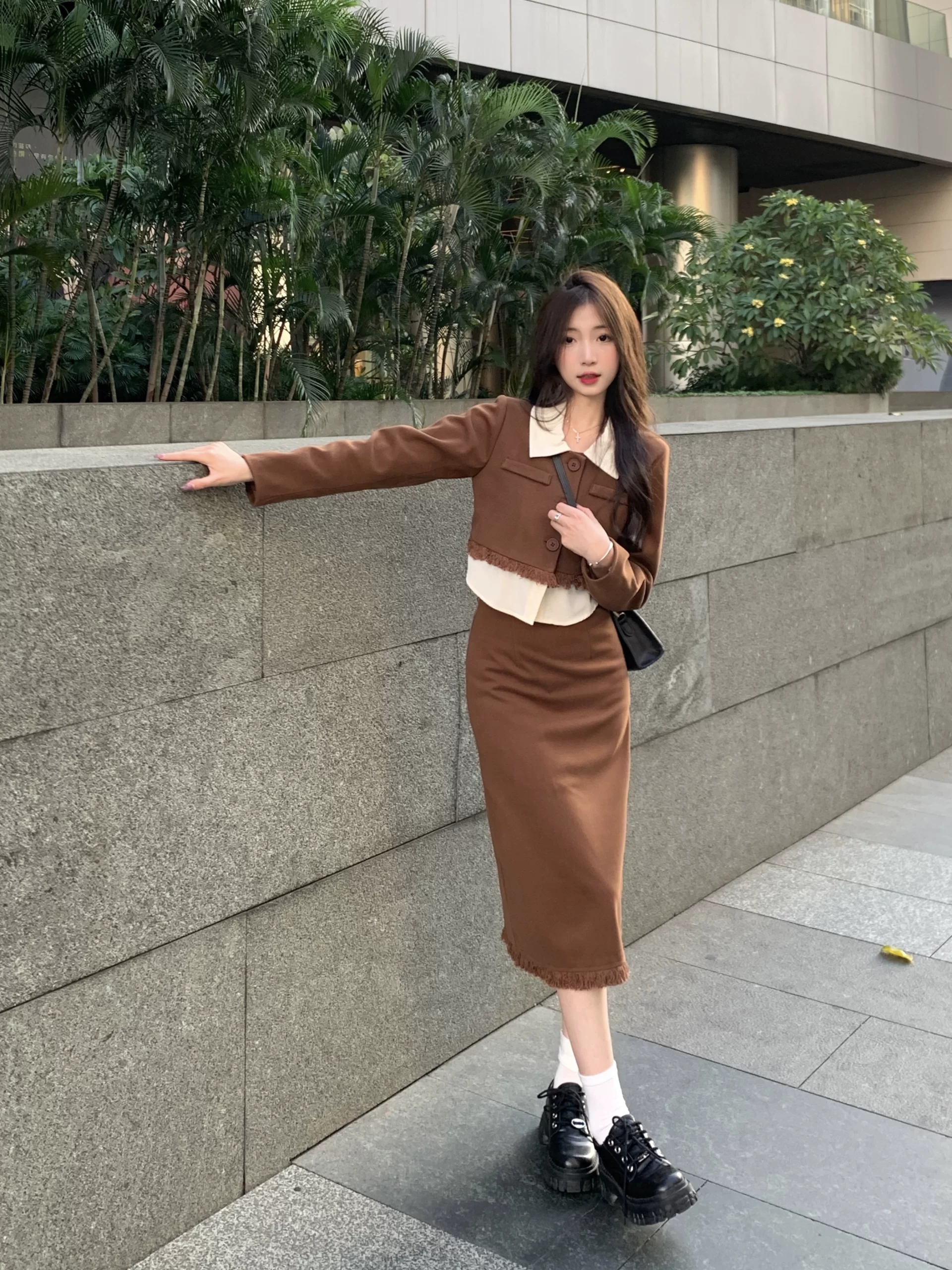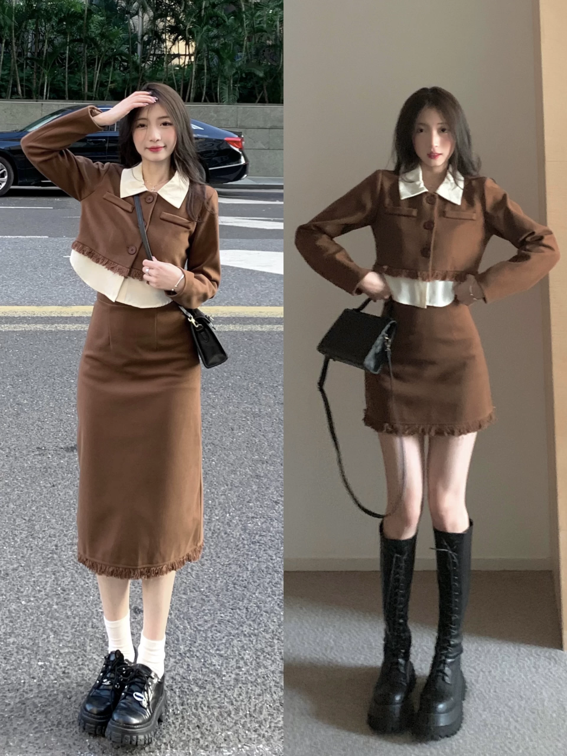 | nameOriginal | Plus size fat MM autumn hot girl design niche short fringed jacket layered with hip-covering skirt two-piece trendy set |