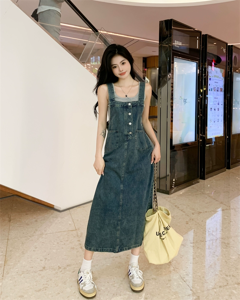 Large size hot girl fat mm pear-shaped retro denim strap skirt