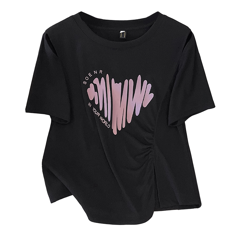 plus size Love Printed Shoulder Short-sleeved T-shirt Women's 2024 New Summer Design Sense Pleated Irregular Top Fat M