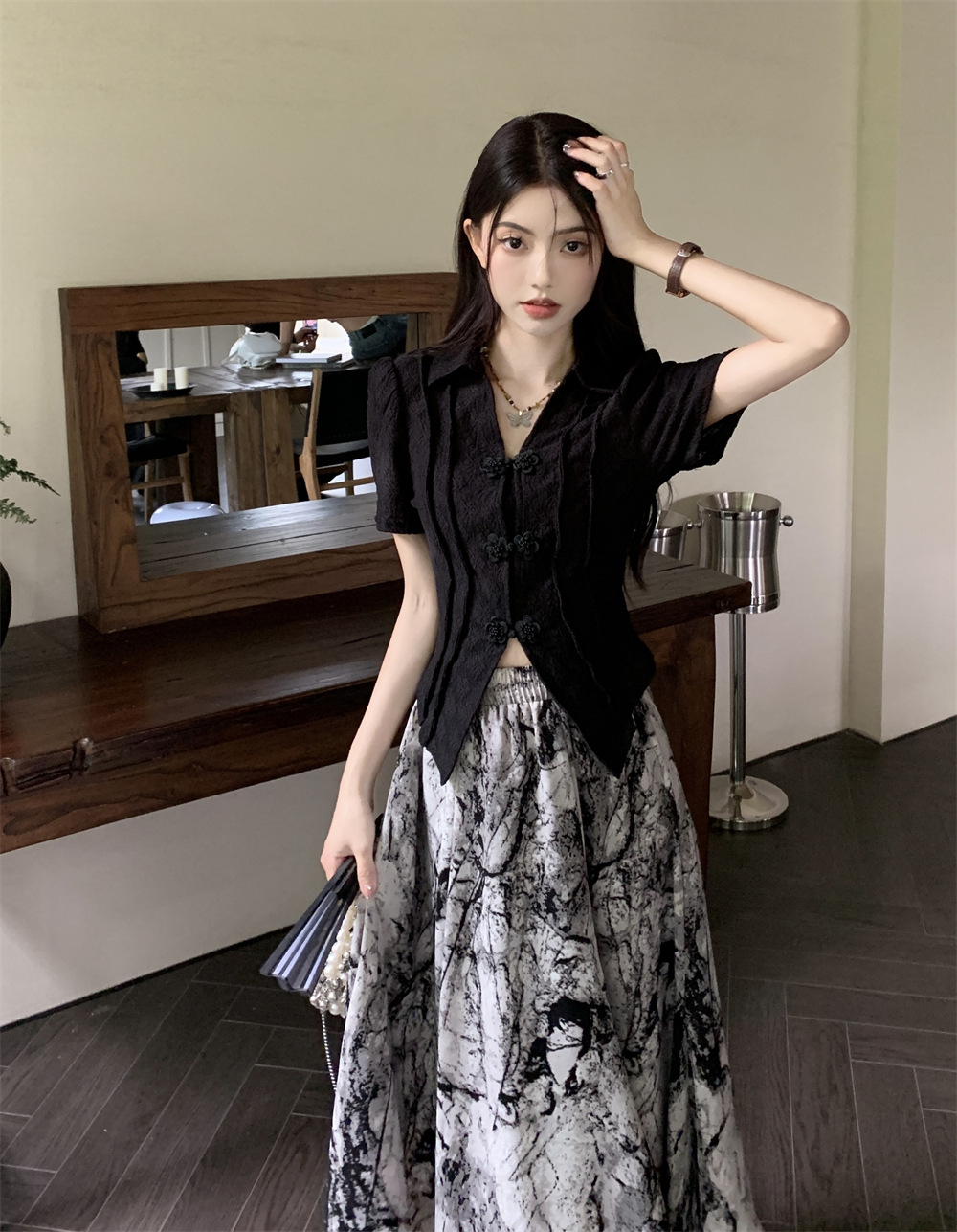 | nameOriginal | plus size New Chinese Style National Style suit Short-sleeved Shirt Women's Summer Chubby Ink Half-length Skirt Design Two-piece Set |