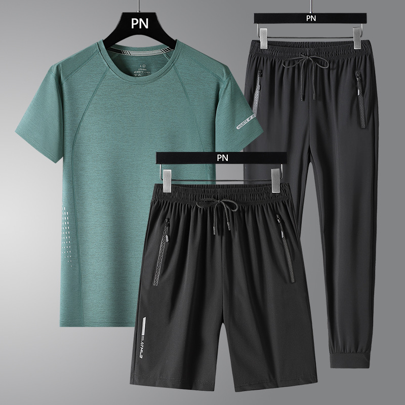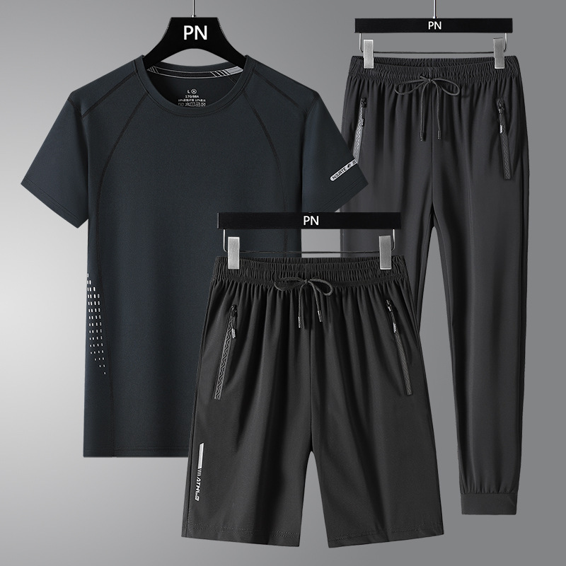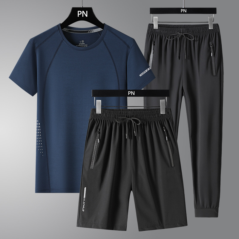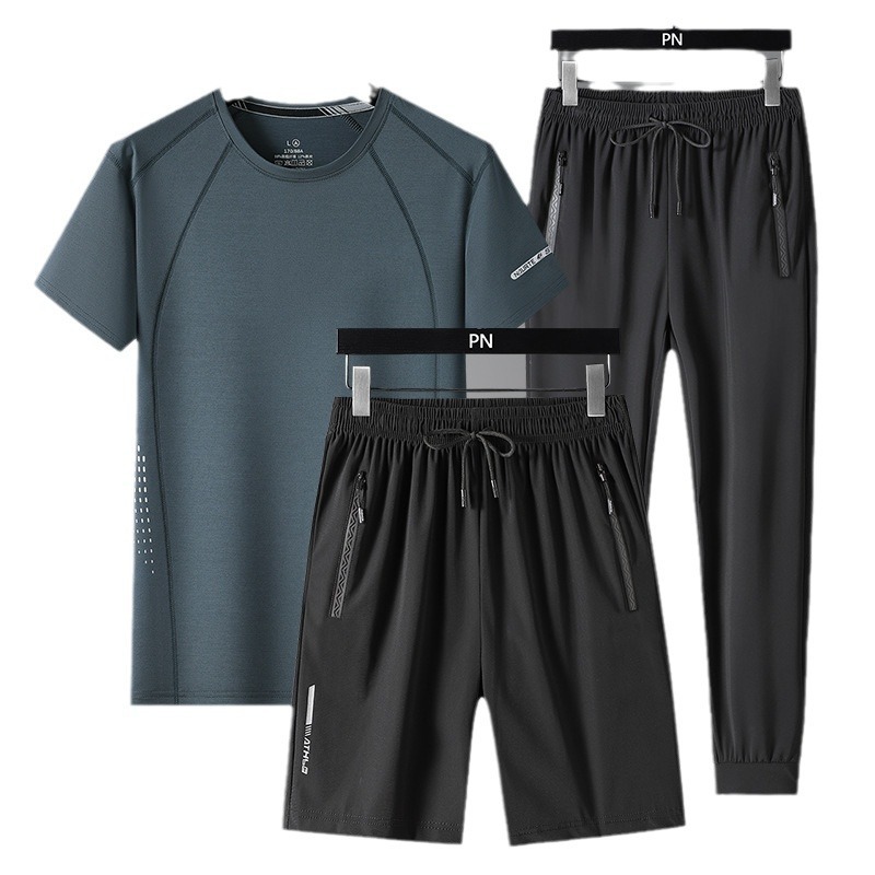 plus size New Summer New Round Neck Ice Silk suit Elastic Beam Quick-drying Breathable Short-sleeved Three-piece Men's Wear