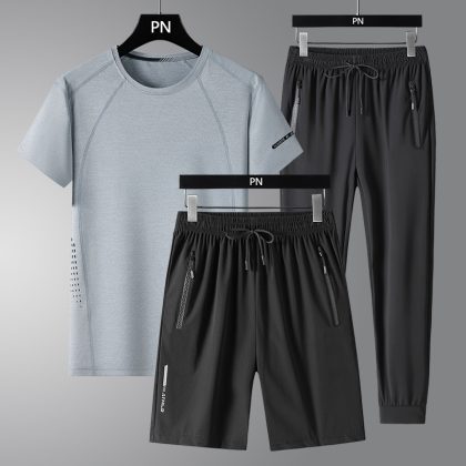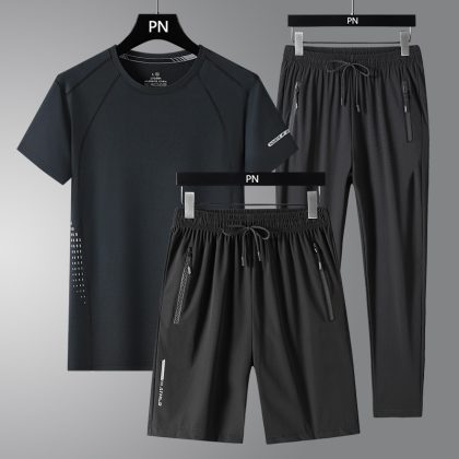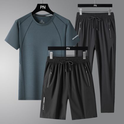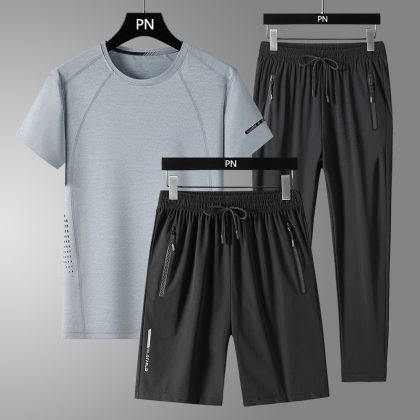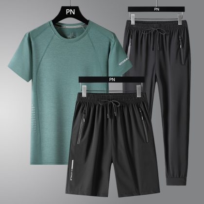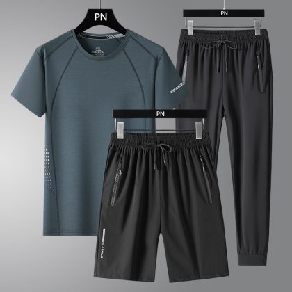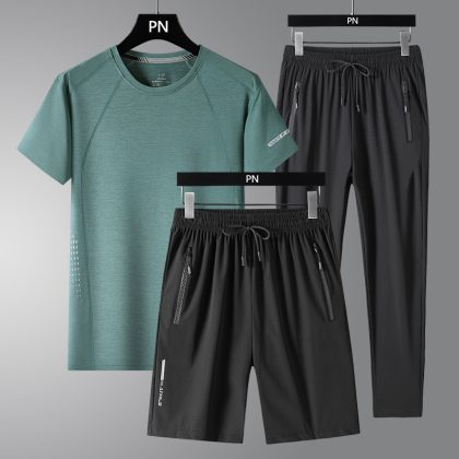 plus size New Summer New Round Neck Ice Silk suit Elastic Beam Quick-drying Breathable Short-sleeved Three-piece Men’s Wear
