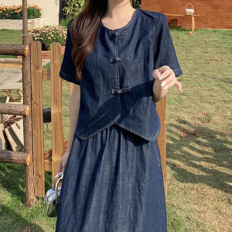 | nameOriginal | plus size Set Matching Age-reducing Denim Skirt suit Women's Summer 2024 Flesh-covered Slim A- line Long Skirt Two-piece Set |