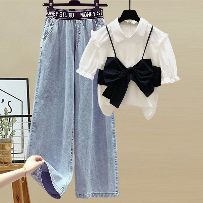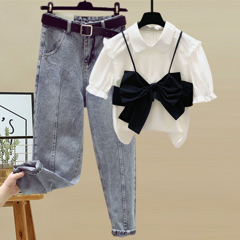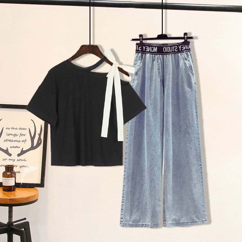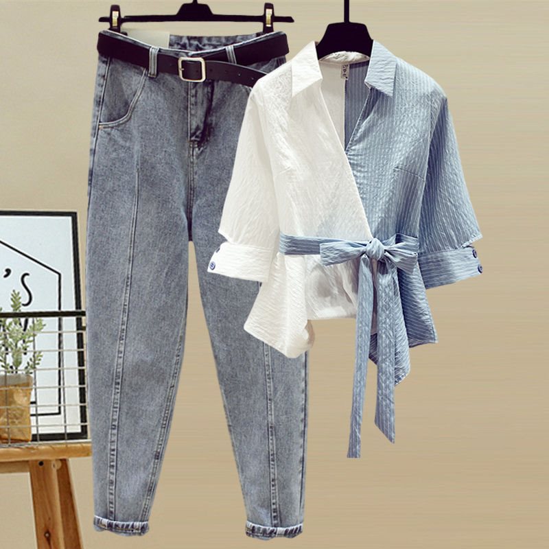 | nameOriginal | plus size women's 200kg fat sister summer suit women's age-reducing slim coat high waist jeans two-piece set |