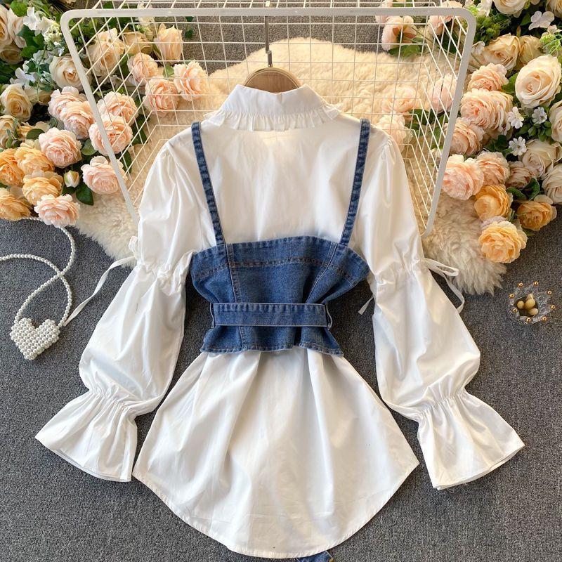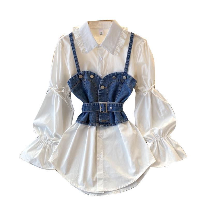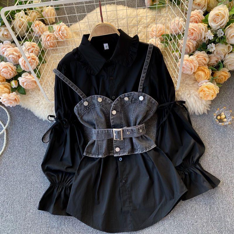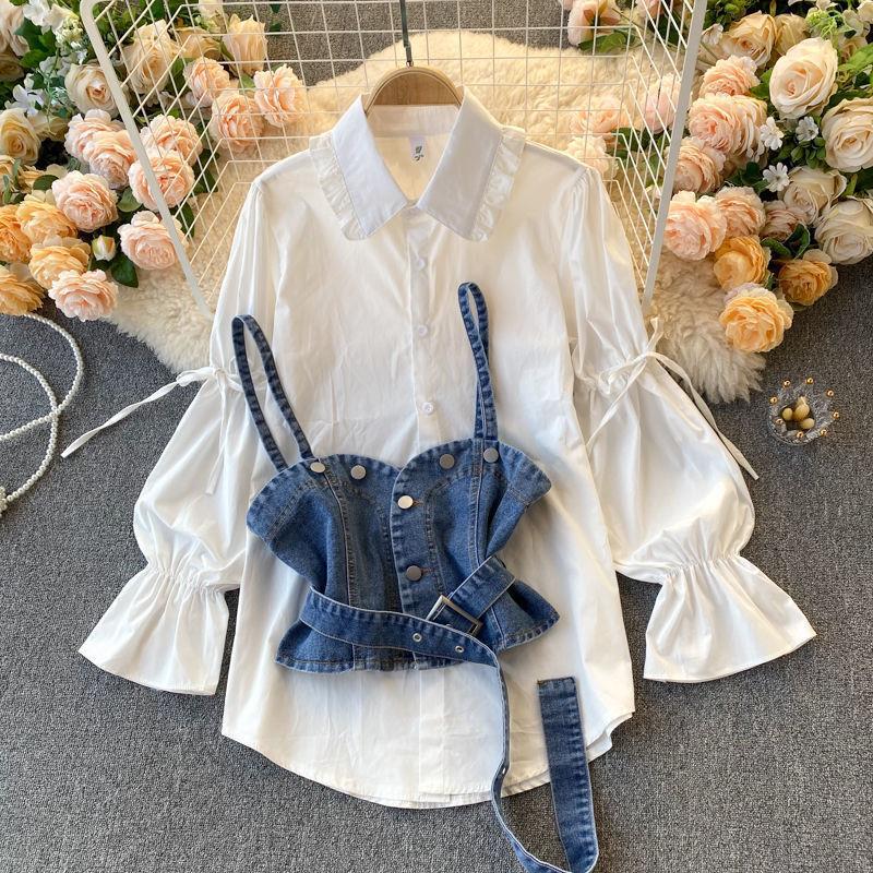 | nameOriginal | Plus size women's 2023 autumn shirt women's design sense niche puff sleeve Denim camisole stacked two-piece suit |