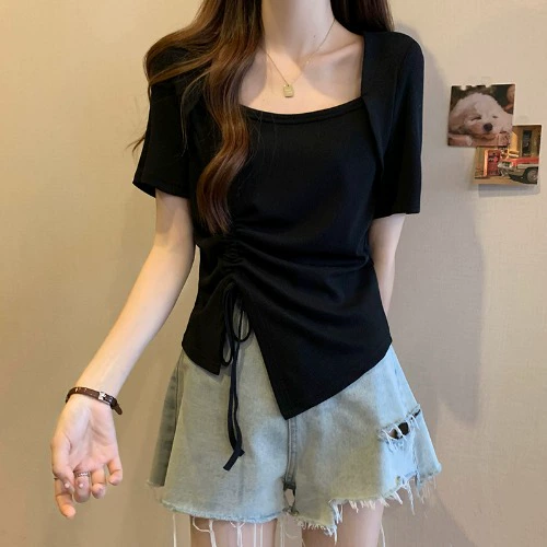 | nameOriginal | Plus size women's 2024 new summer style slimming square neck tops for fat mm irregular right shoulder short-sleeved T-shirts |