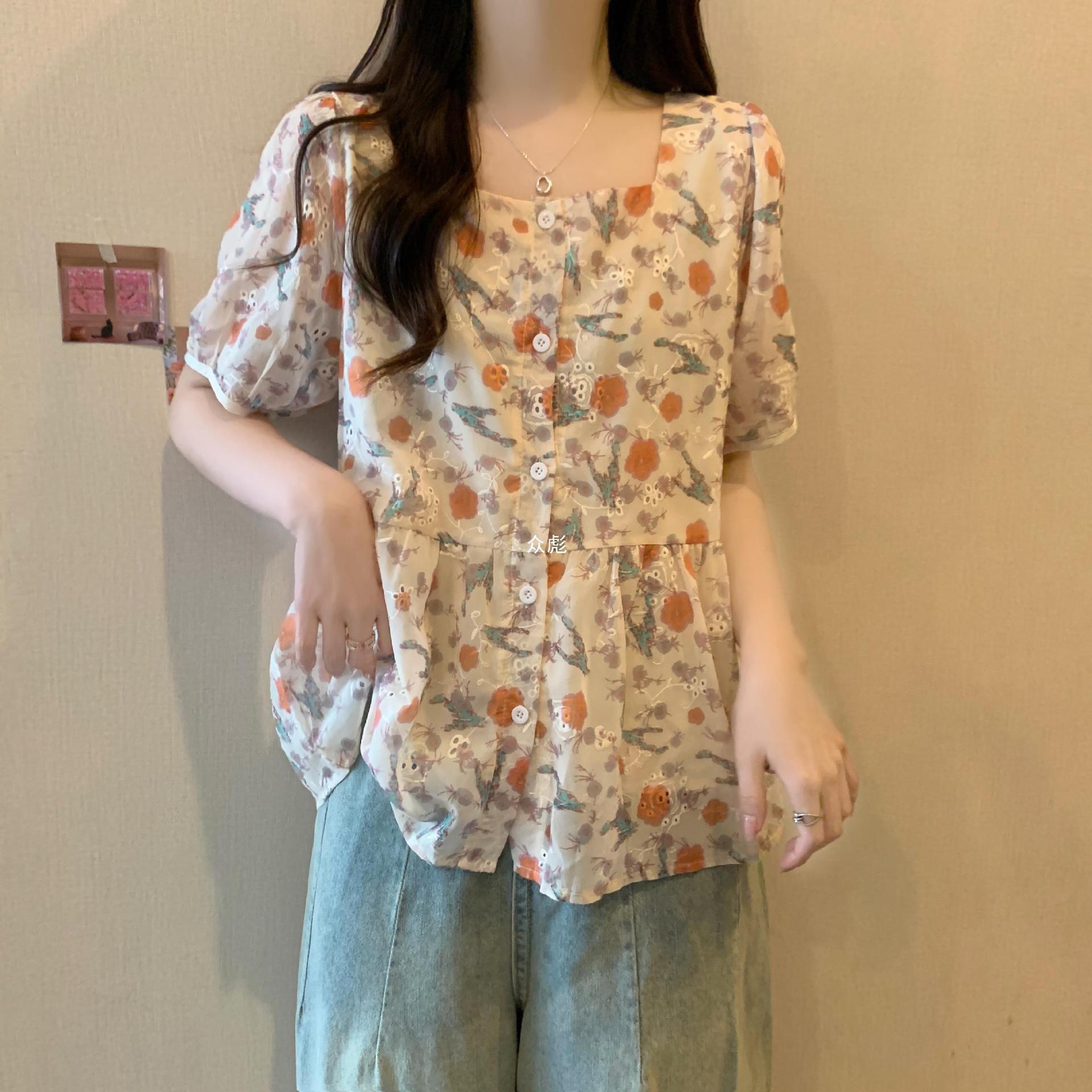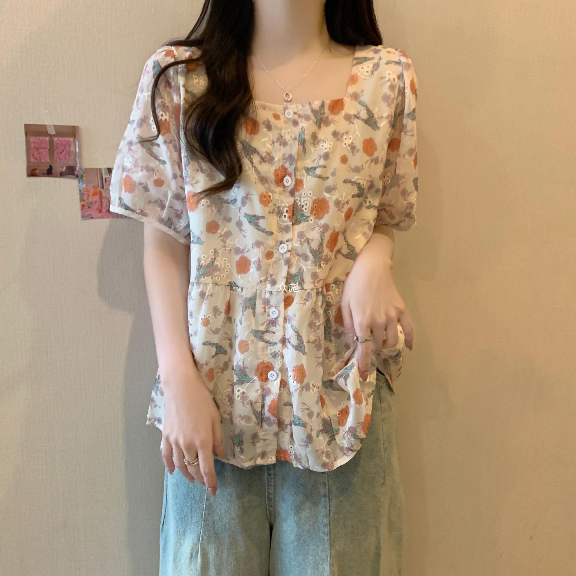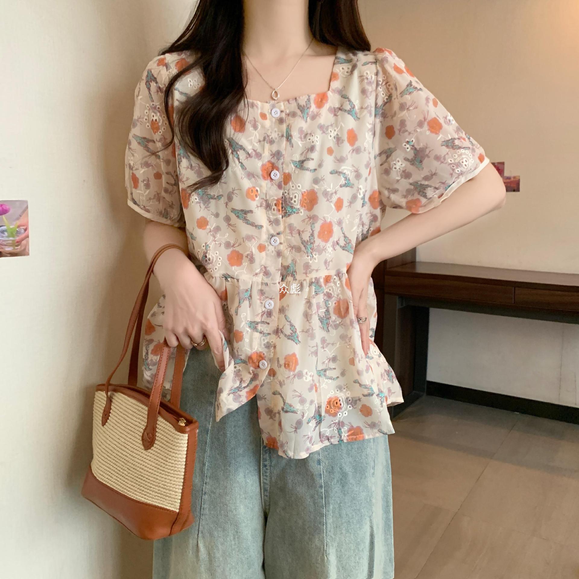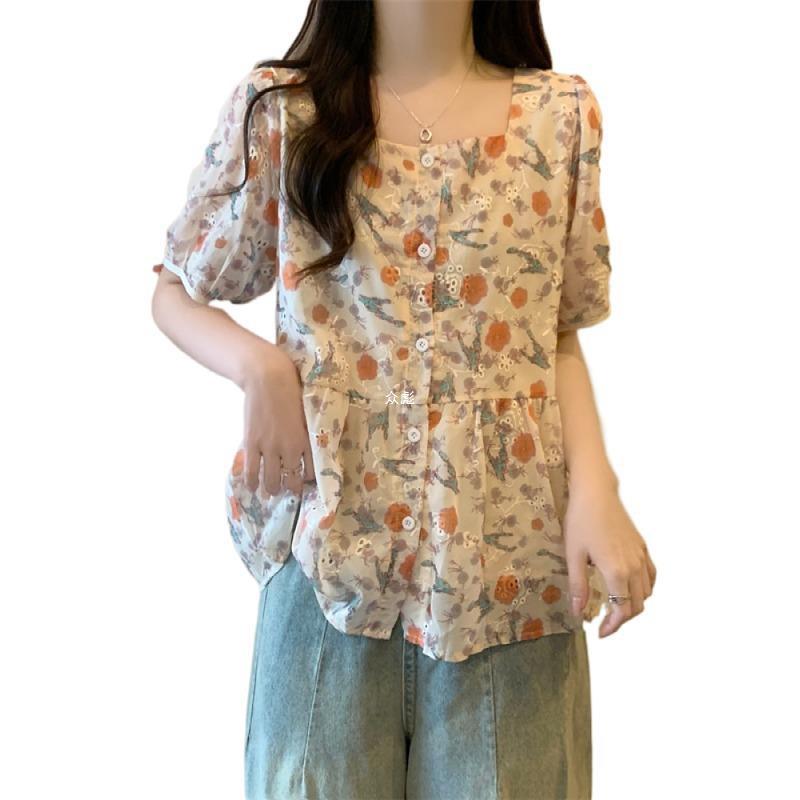 | nameOriginal | plus size Women's 2024 Summer New Slimming Square Collar Floral Chiffon Shirt for Chubby Girls Loose Belly Covering Short Sleeve Top Zb |