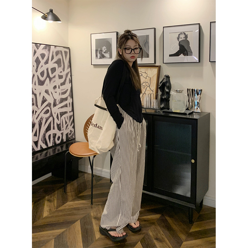 Plus size women's American-style retro texture black and white vertical striped trousers women's loose casual all-match straight wide-leg pants
