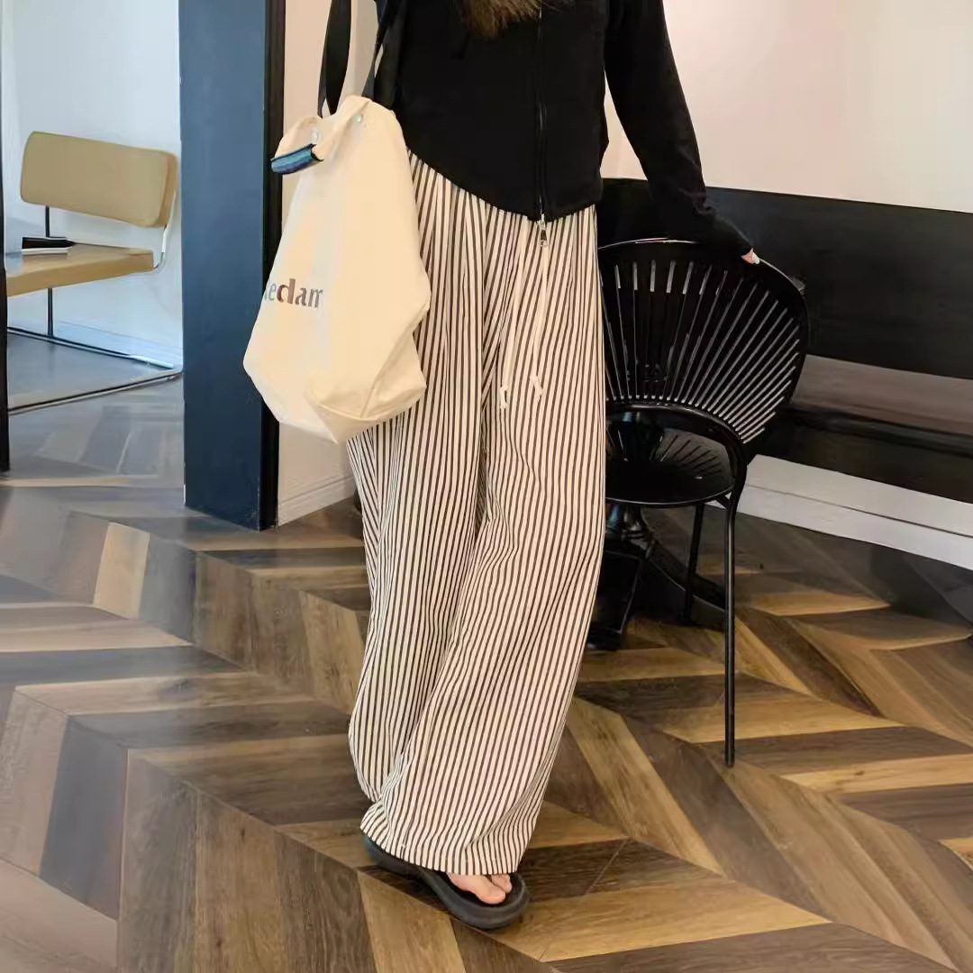 Plus size women’s American-style retro texture black and white vertical striped trousers women’s loose casual all-match straight wide-leg pants