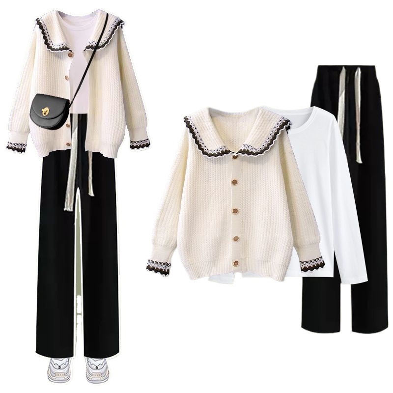 plus size women’s autumn suit women’s 2022 new French temperament sweater shirt slim wide leg pants three-piece suit