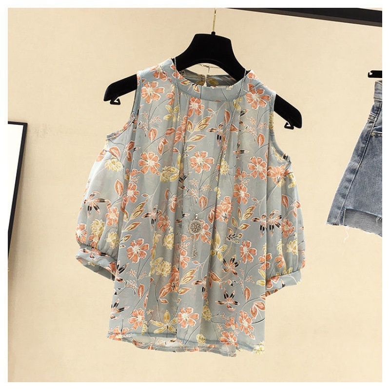 | nameOriginal | plus size Women's Chubby Girl Summer Short-sleeved Chiffon Shirt Floral Shoulder Top Slimming Belly-covering Foreign Style Small Shirt |