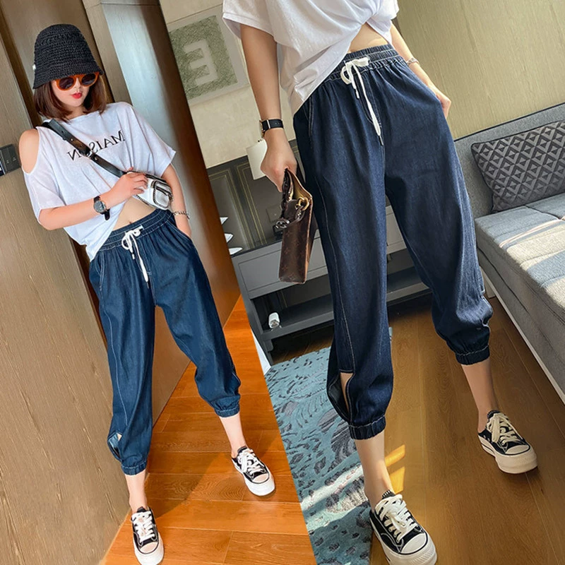 Large size women’s clothing 2024 summer thin Tensil Harlan jeans Fat sister mm loose slimming nine-point dad pants