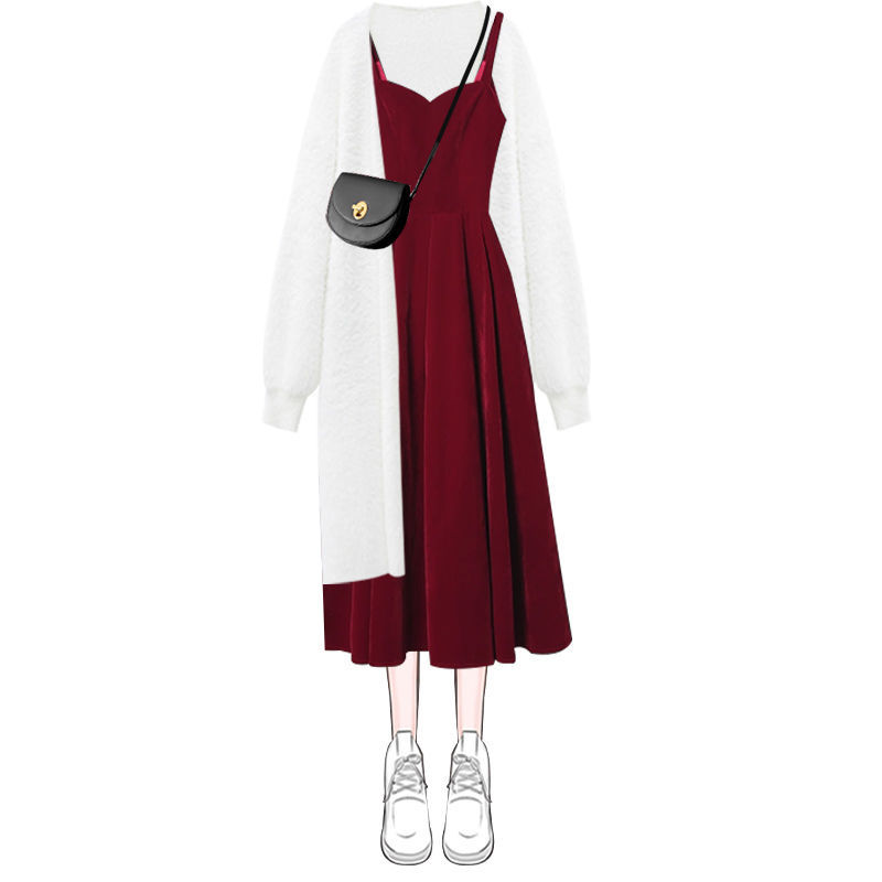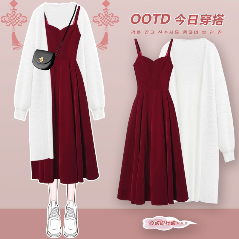 | nameOriginal | Plus size women's clothing early winter suit 2023 new French retro style sweater cardigan sling dress two-piece set |