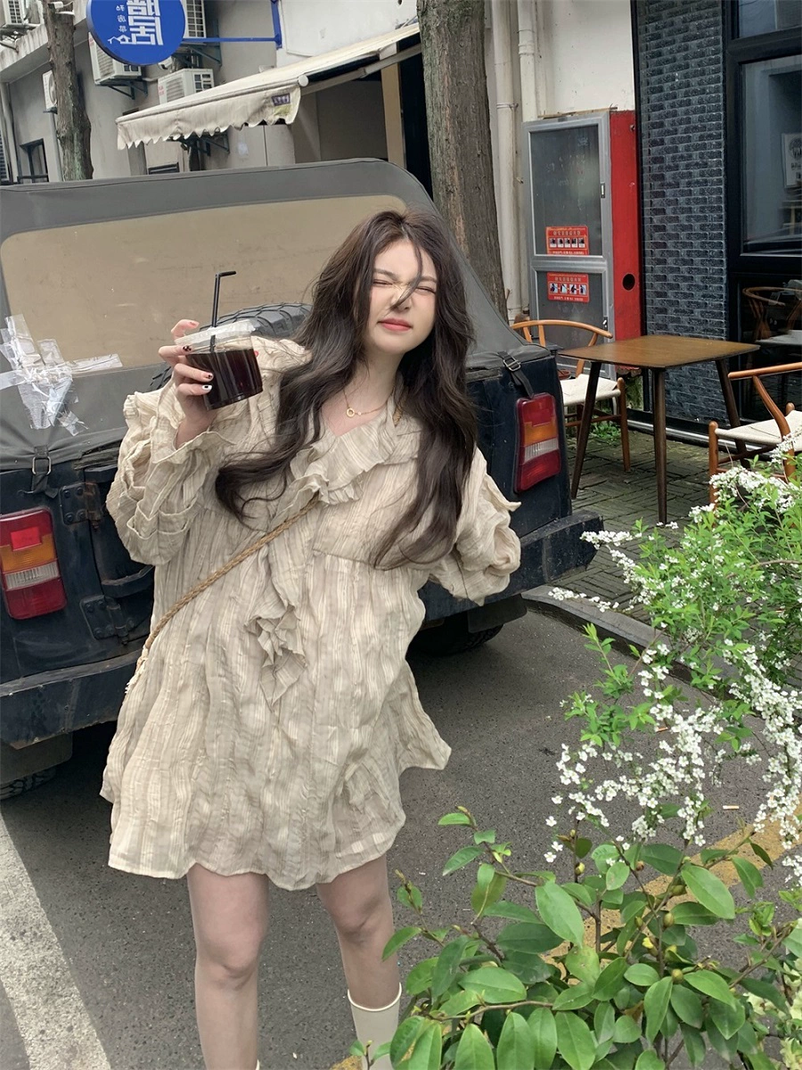 Plus size women's clothing for fat mm 2024 spring and summer French retro sweet loose body-covering and age-reducing ruffled long-sleeved dress