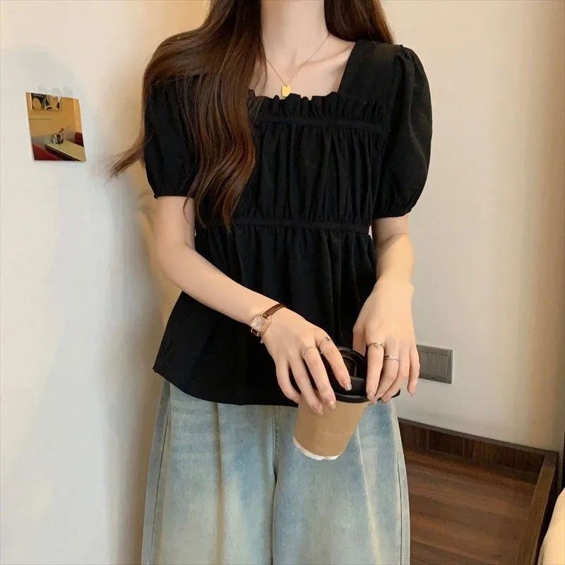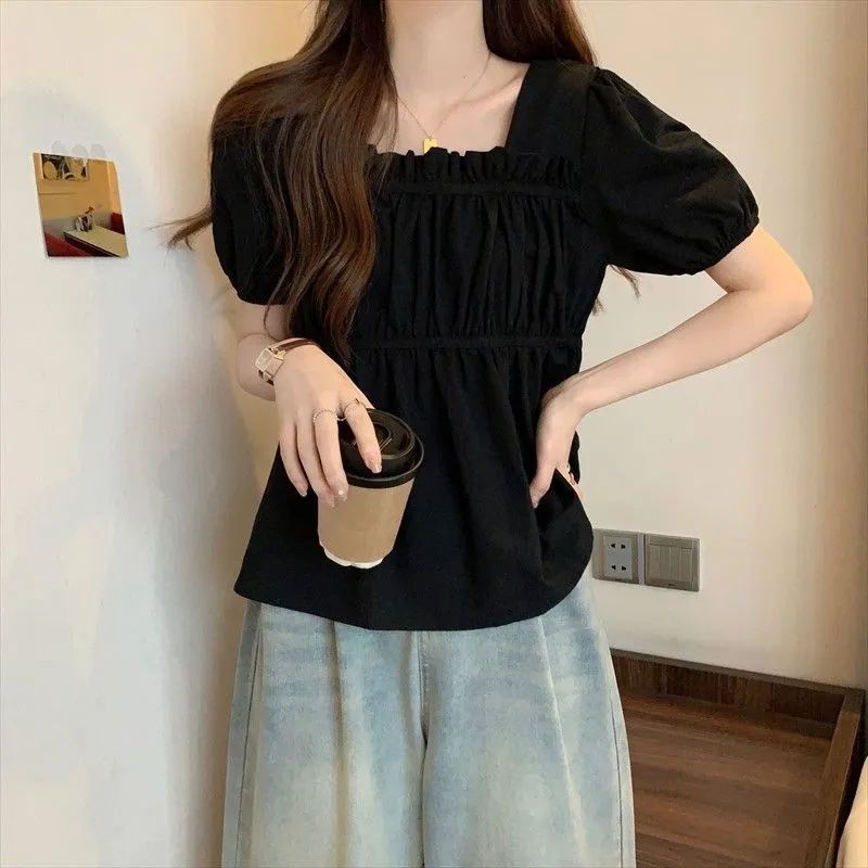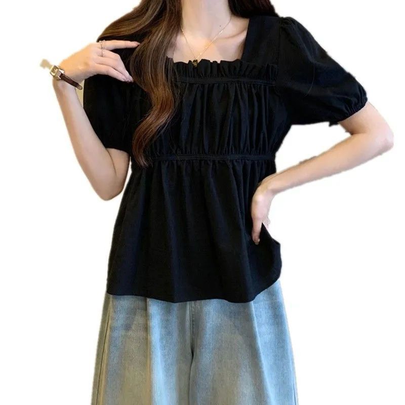 | nameOriginal | plus size Women's Clothing Niche Summer Short-sleeved Top Women's Chubby Slimming Design Pleated Stretch Waist Tight Doll Shirt Trendy |