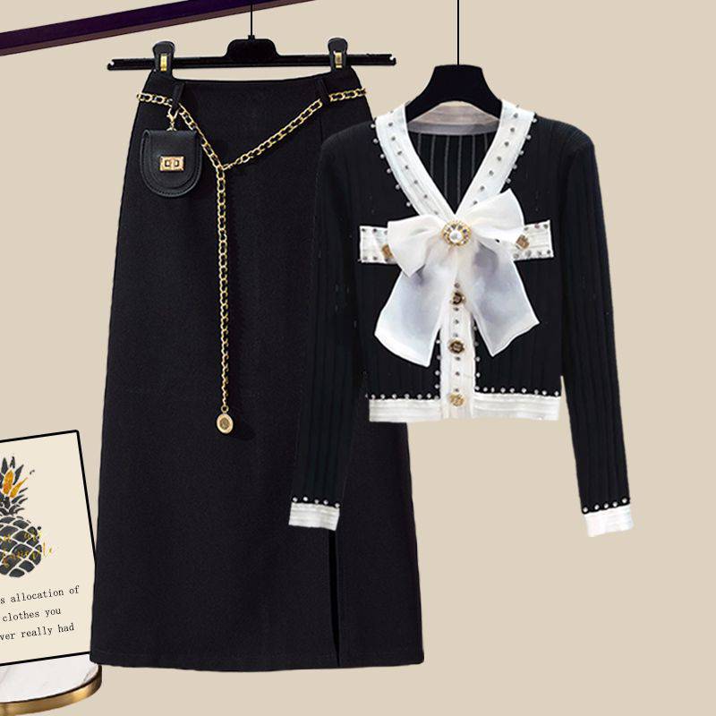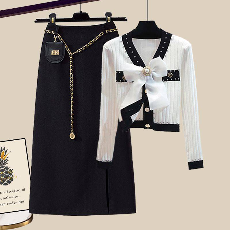 Plus size women’s clothing spring suit women’s 2023 new meat-covering Chanel style knitted cardigan skirt two-piece set