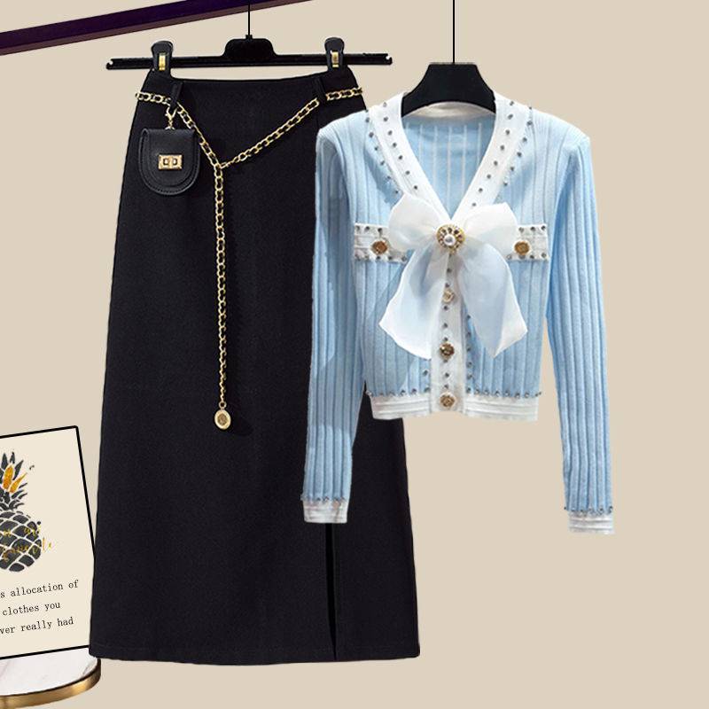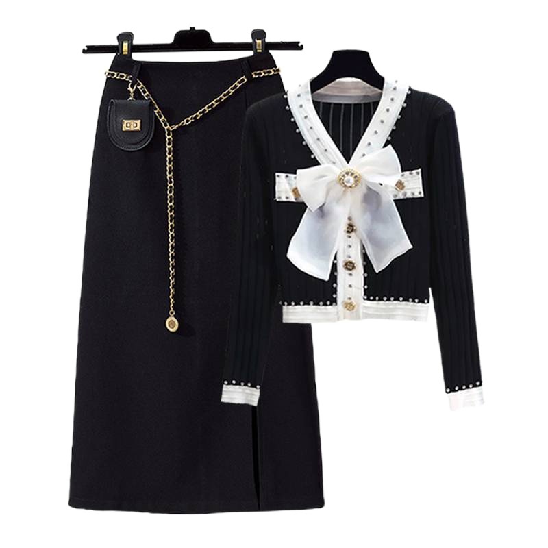 Plus size women's clothing spring suit women's 2023 new meat-covering Chanel style knitted cardigan skirt two-piece set