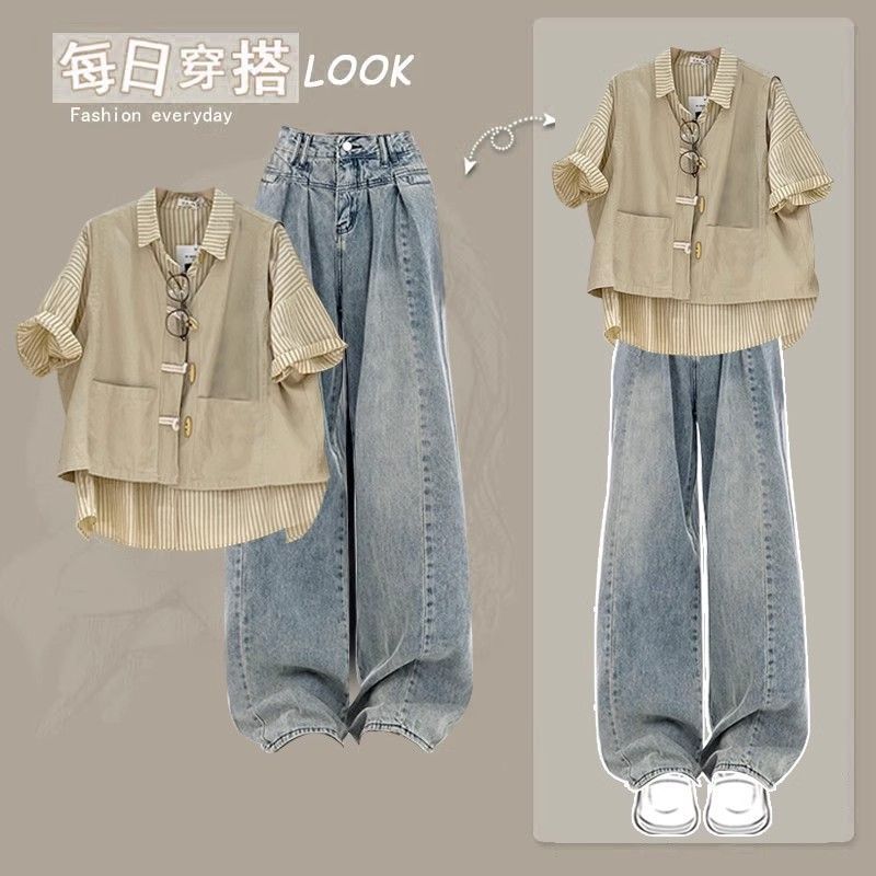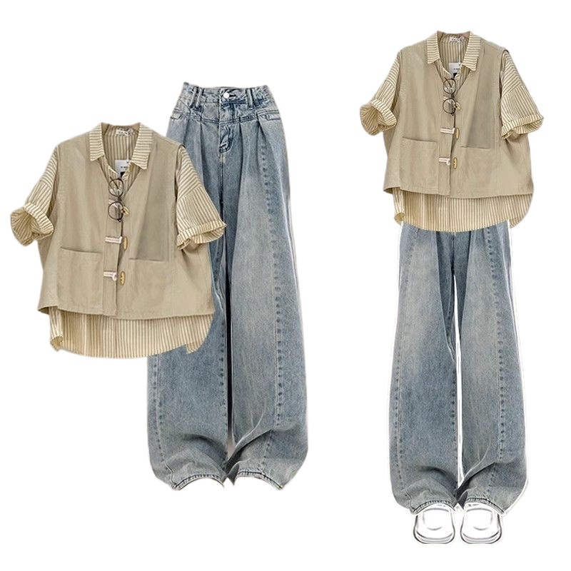 | nameOriginal | plus size Women's Clothing Summer suit Women's 2024 New Fashion Western Style Vest Striped Shirt Jeans Three-Piece Trendy Set |