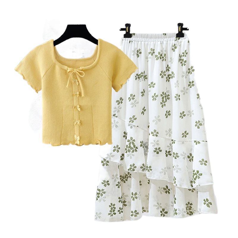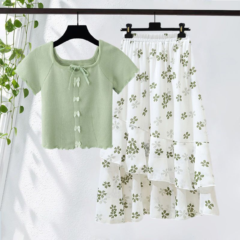 plus size Women's Clothing Summer suit Women's New Slimming Age-reducing Sweet Top Floral Skirt Two-piece Set Trendy