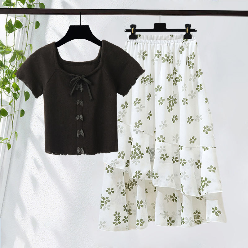 plus size Women’s Clothing Summer suit Women’s New Slimming Age-reducing Sweet Top Floral Skirt Two-piece Set Trendy