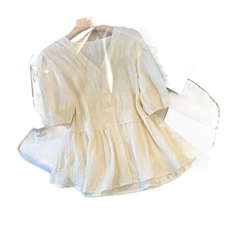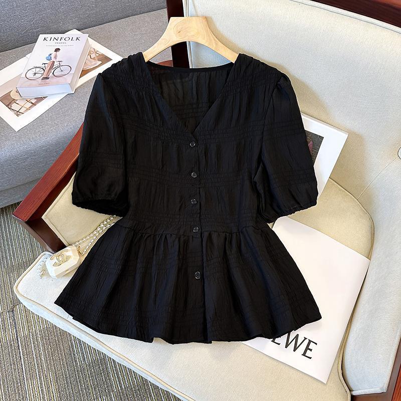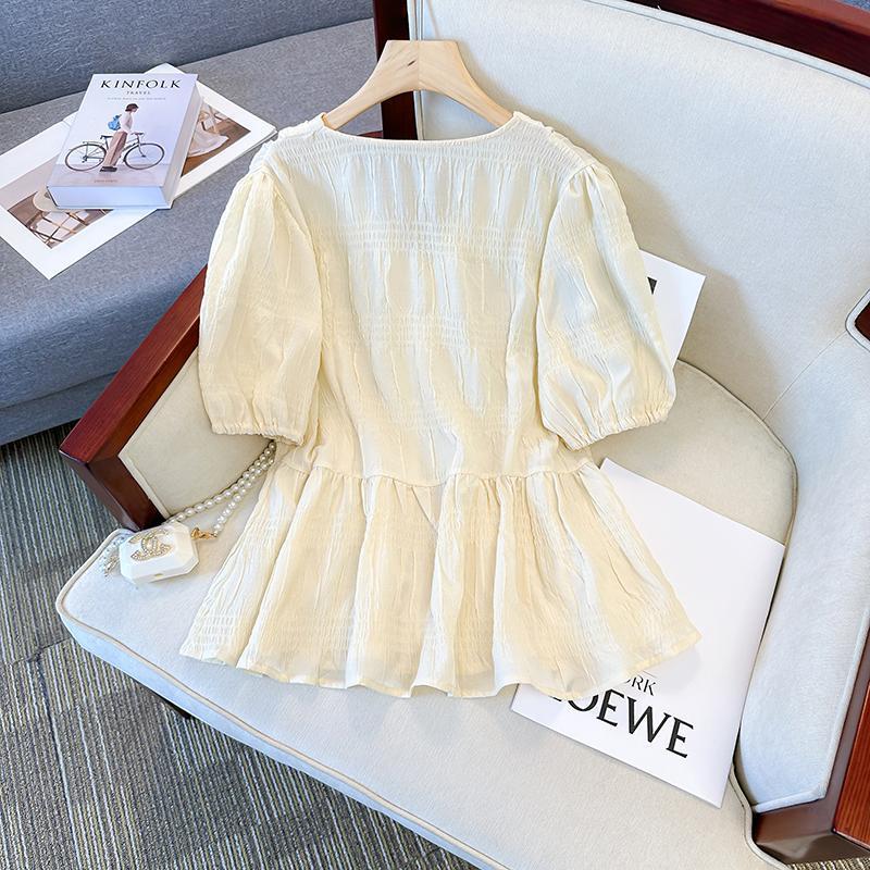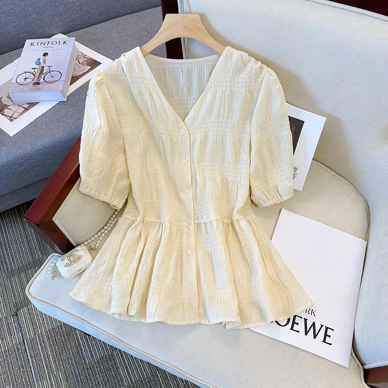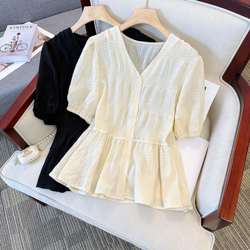 | nameOriginal | plus size Women's Fashionable Pleated V-Neck Top 2024 Summer New Style Chubby Sister's Age-reducing Belly Covering Waisted Chic Shirt |