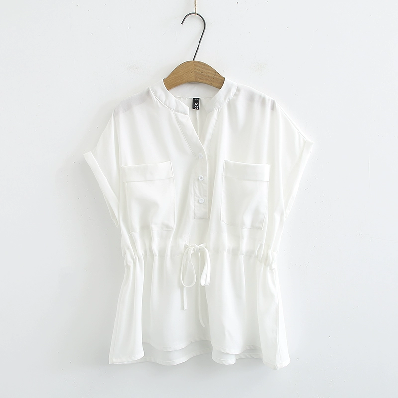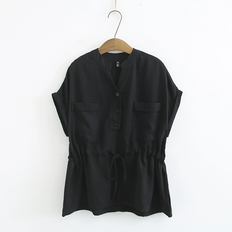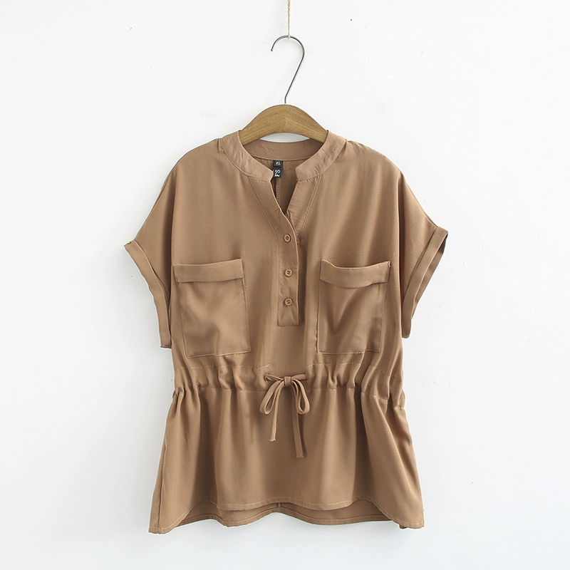 Large size women’s new pullover summer plus size fat MM waist-closing V-neck three-pin buckle pocket casual shirt