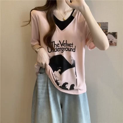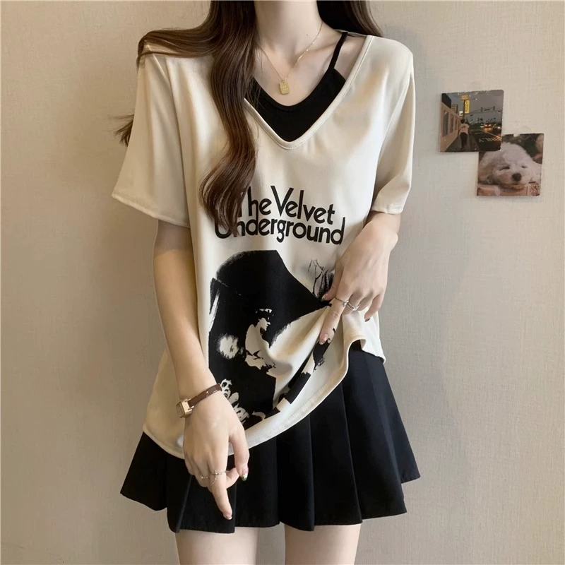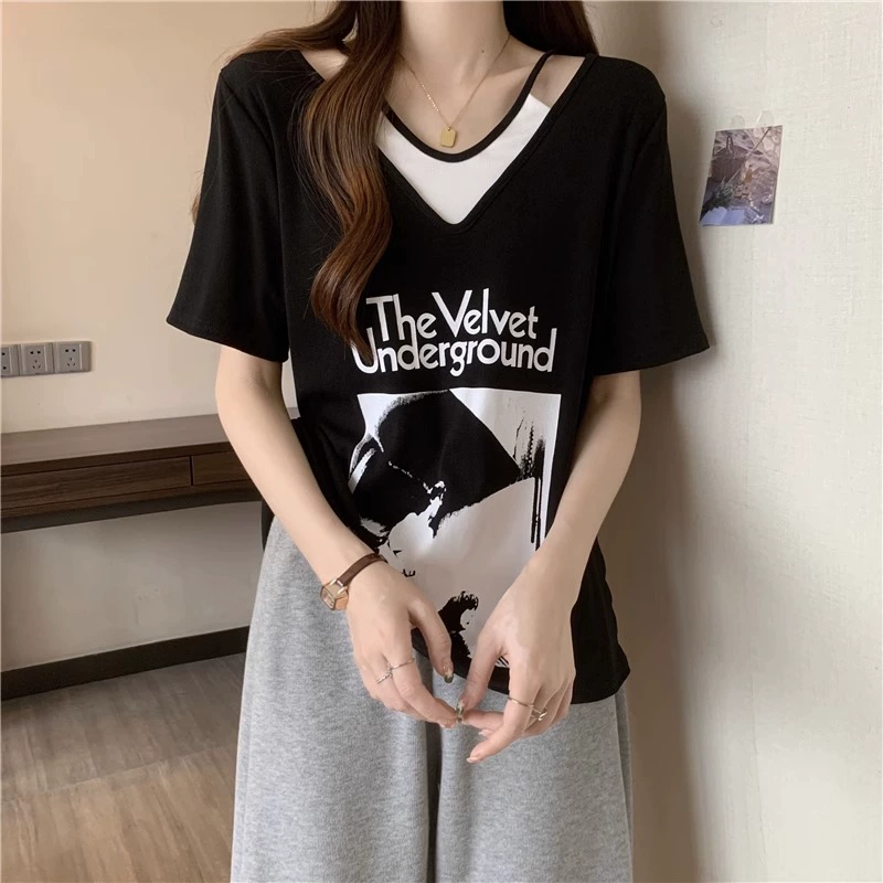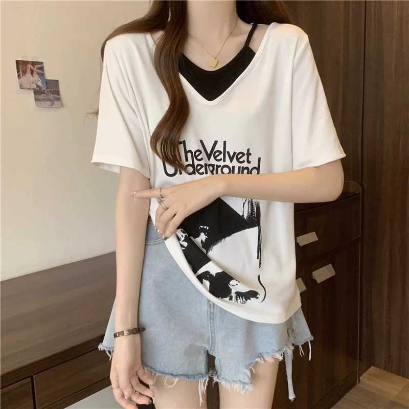 | nameOriginal | Plus size women's right shoulder short-sleeved t-shirt for women who are slightly chubby, mmv collar, slimming, off-shoulder, fake two-piece versatile tops for women in summer |