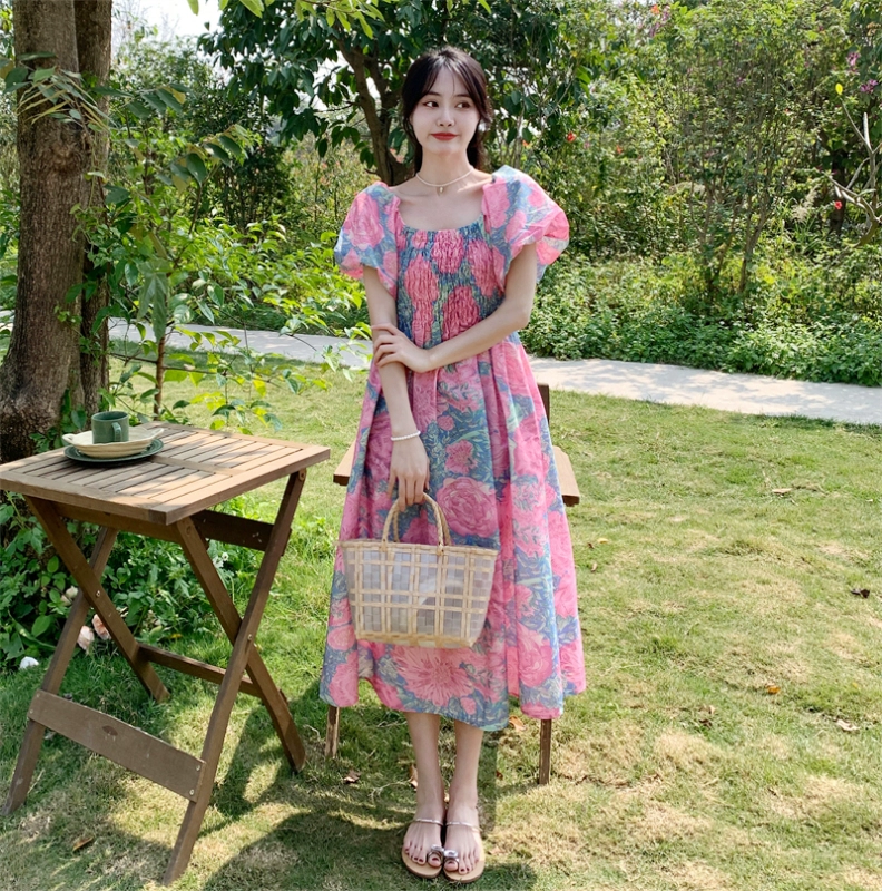 Plus size women’s slimming dress in summer for women with puff sleeves, pear-shaped body, slightly chubby wear, long skirt, fat mm skirt