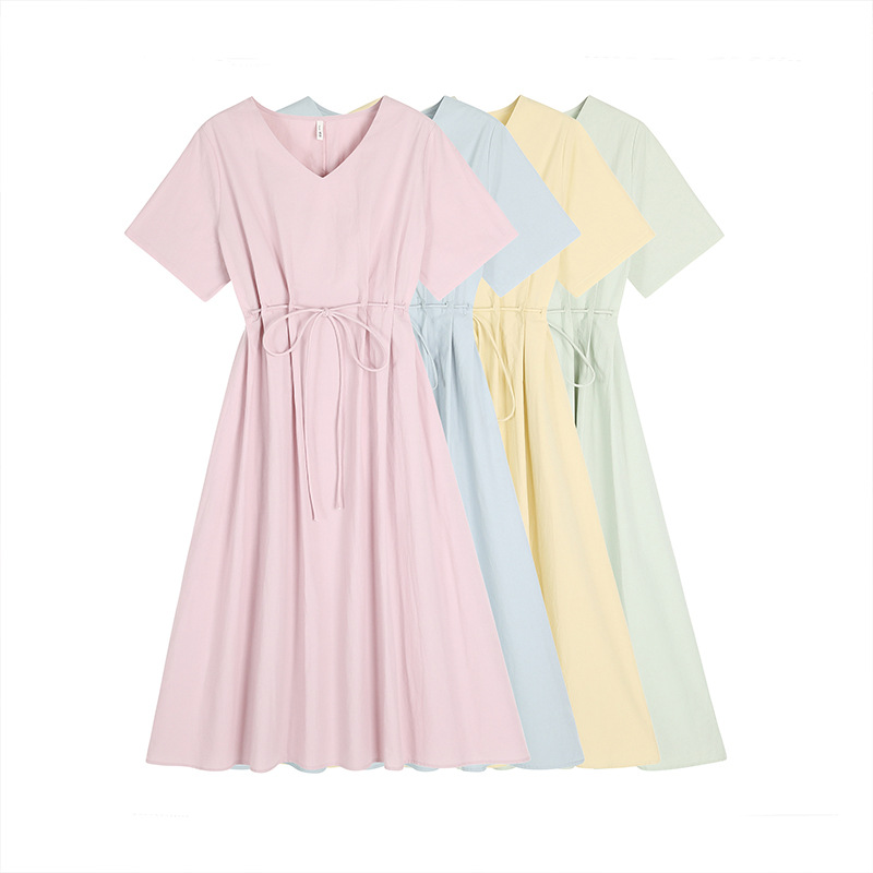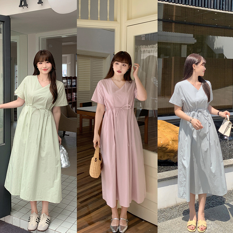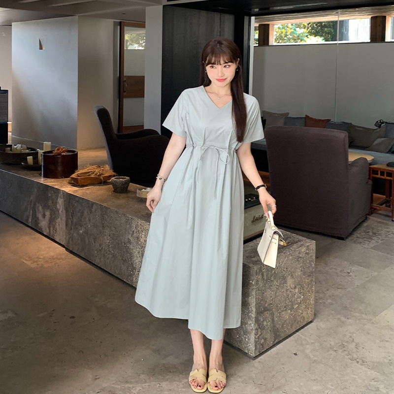 plus size Women's Solid Color All-match V-neck dress Women's Summer chubby girl Design Sense Strap Elegant Long Skirt 62960