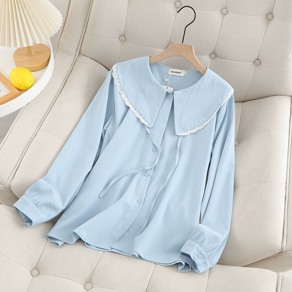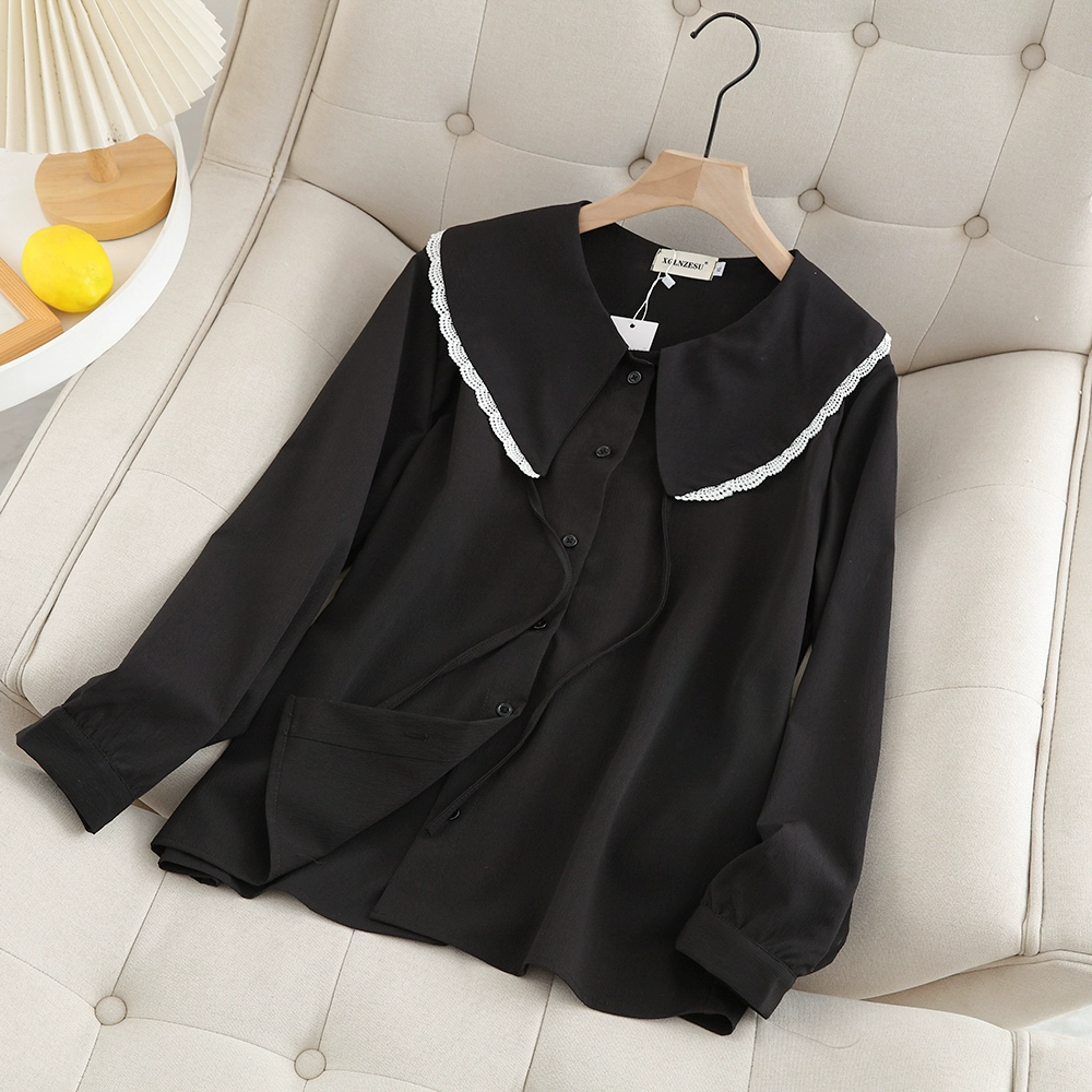 Plus size women’s spring new style fat mm slimming design niche doll collar lace splicing long-sleeved shirt