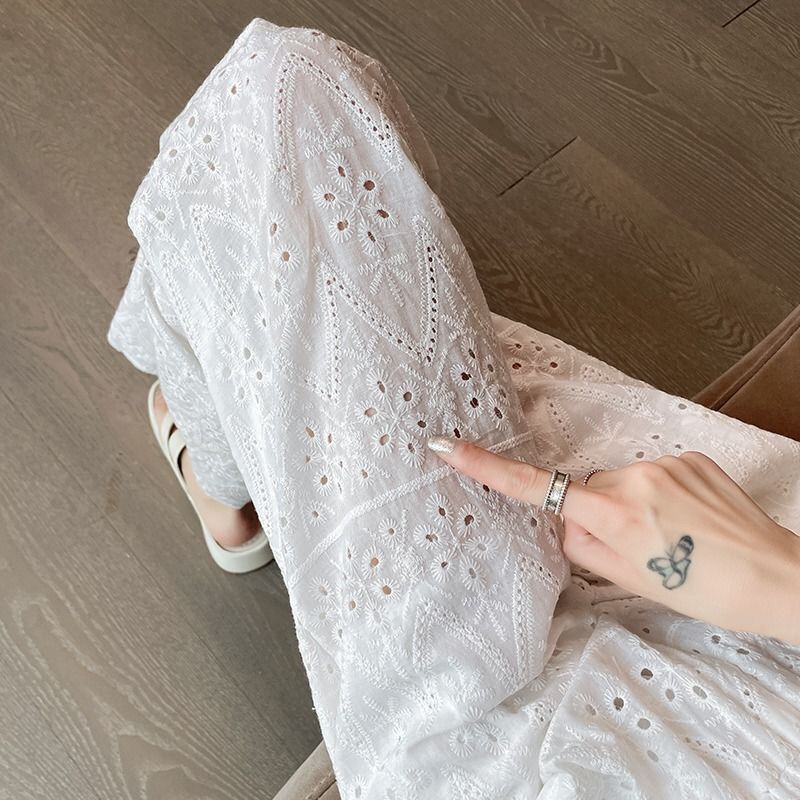 plus size Women’s Straight Leg Wide Leg Pants Women’s Summer Thin Loose Slimming White Embroidered Hollow Casual Cool Pants