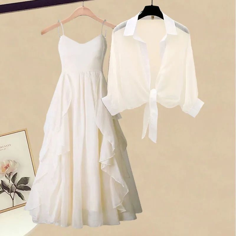 plus size Women's Summer suit Women's 2024 New Waist Slimming Age-reducing Cardigan Mesh Suspender Skirt Two-piece Set Trendy