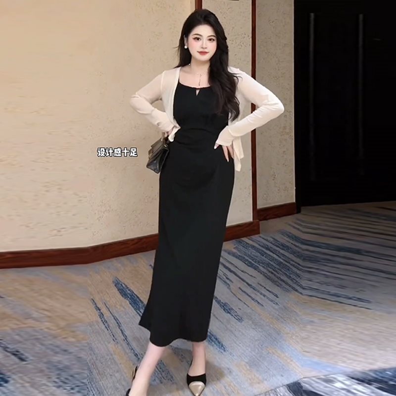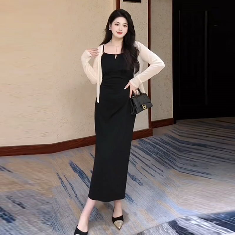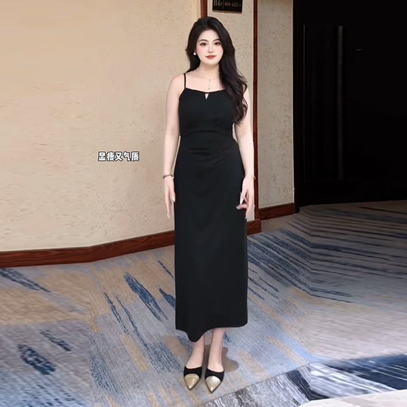 plus size Yujie Sexy Hepburn Style Sling dress Women’s Summer chubby girl Slimming Pleated Waist Split Two-piece Set