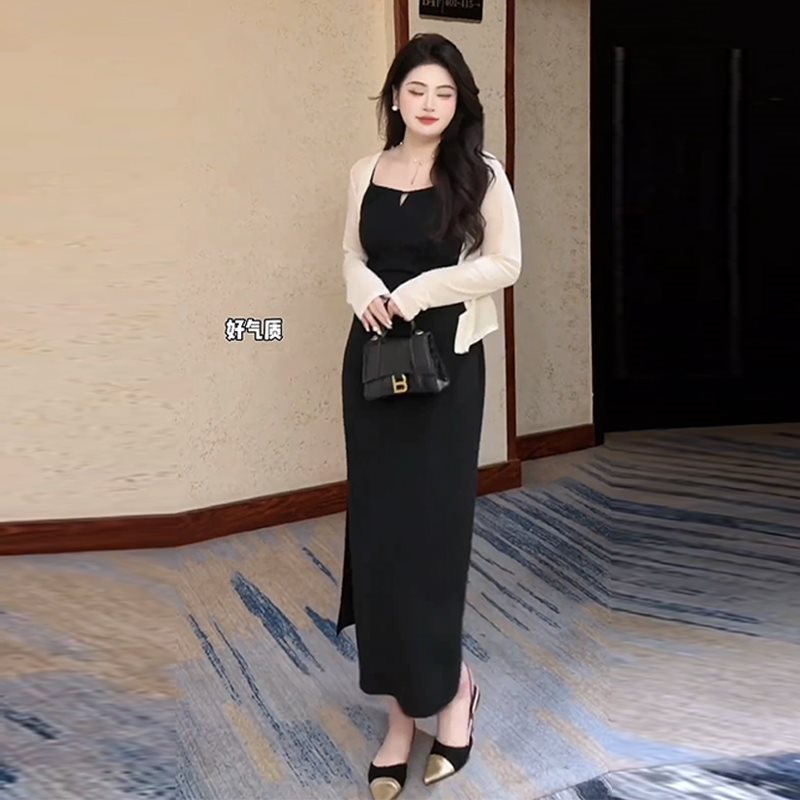 plus size Yujie Sexy Hepburn Style Sling dress Women's Summer chubby girl Slimming Pleated Waist Split Two-piece Set