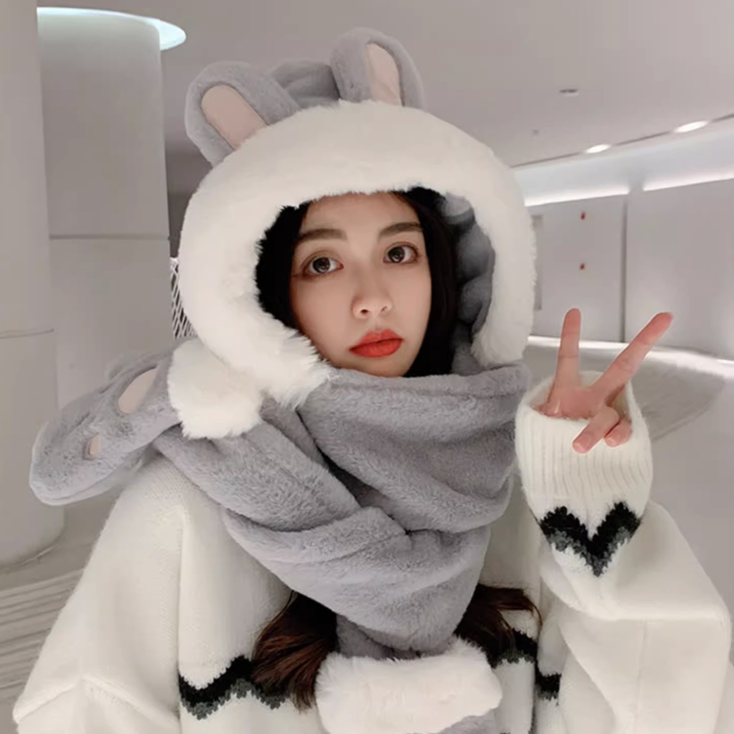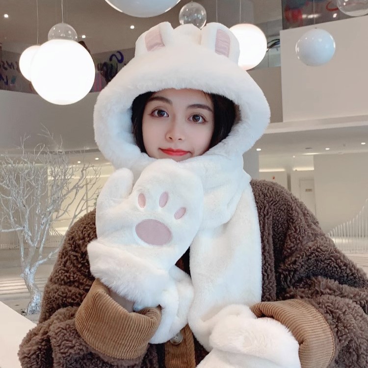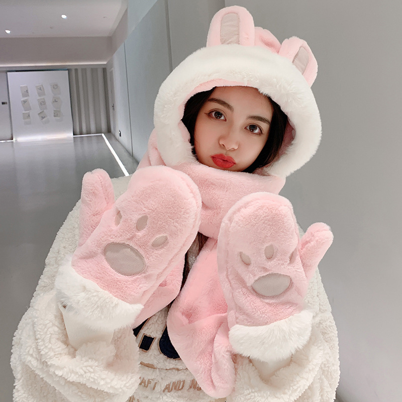 Plush rabbit ears hat scarf women’s winter Korean-style cute thick warm scarf gloves three-piece set
