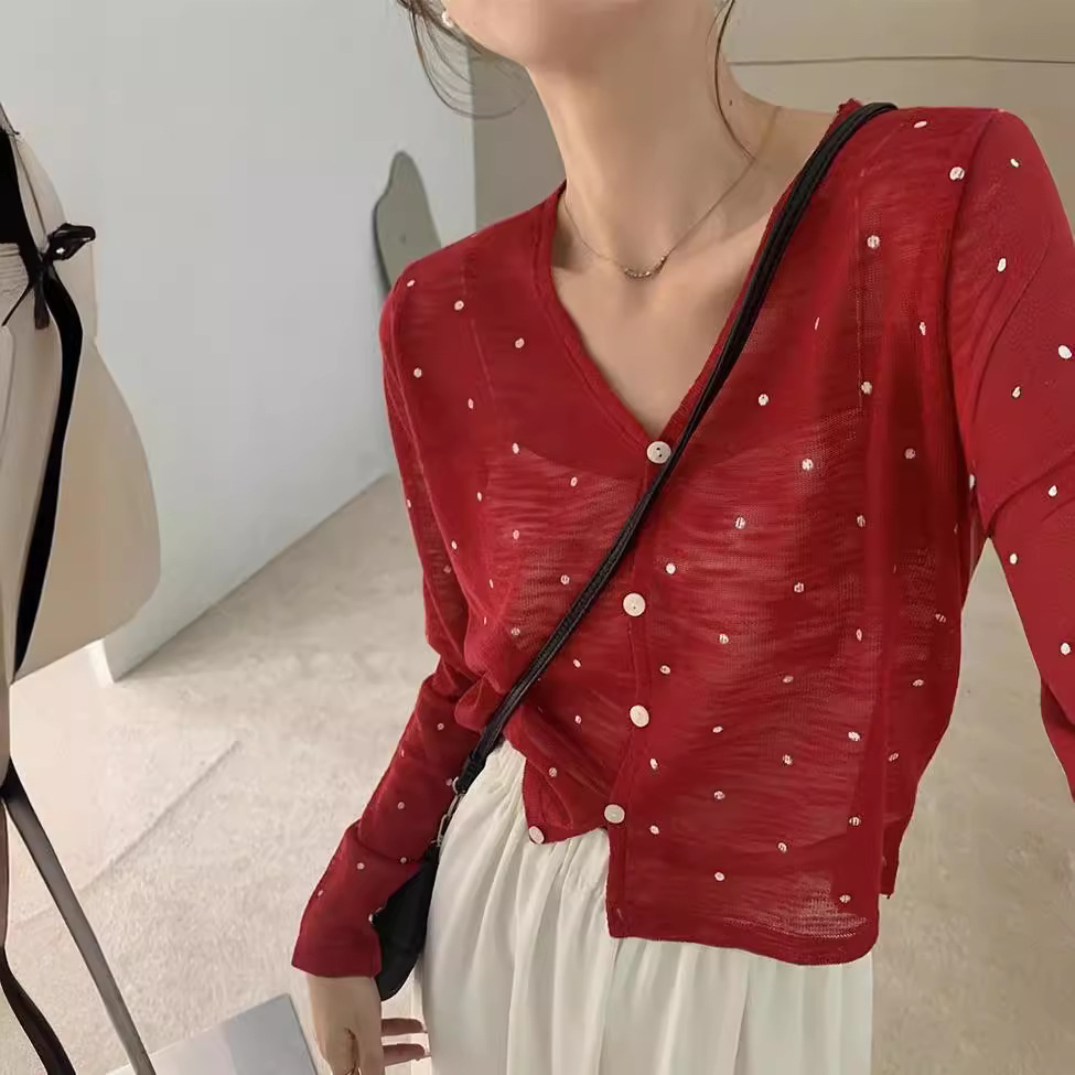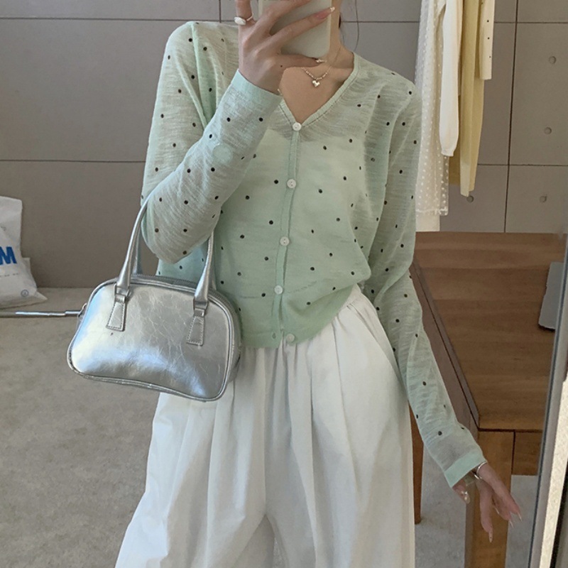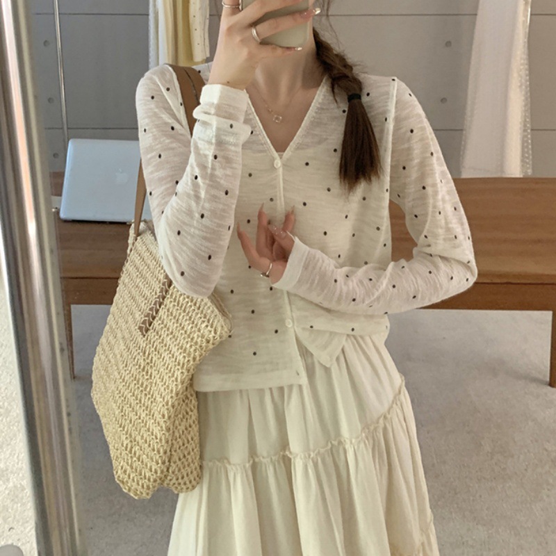 Polka Dot Knitted Cardigan Coat Women’s Ice Silk Sunscreen Thin Shawl Summer Sling Strap Dress Outer Blouse