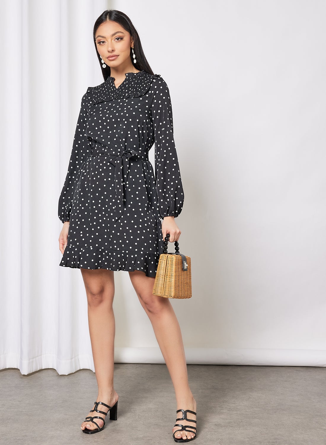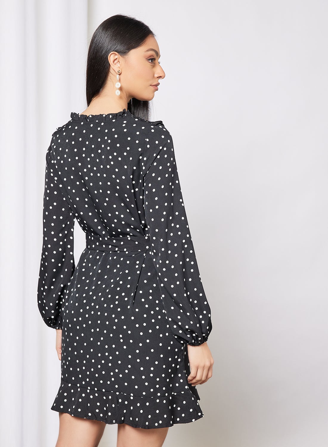 Polka Dot Printed Long Sleeve Mini Dress with Ruffle Hem and Notch Neck in Black Print.